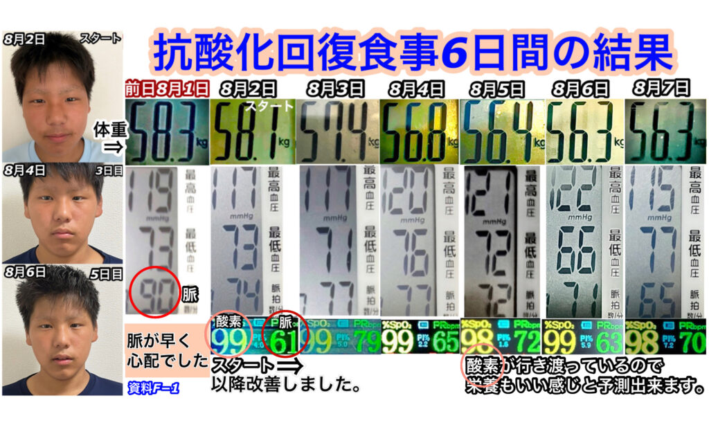 ⬇︎下記の画像は、現行の「一矢流抗酸化回復食事」になります。この健康食事を食べて、もれなく結果データの写真のように変化しています。