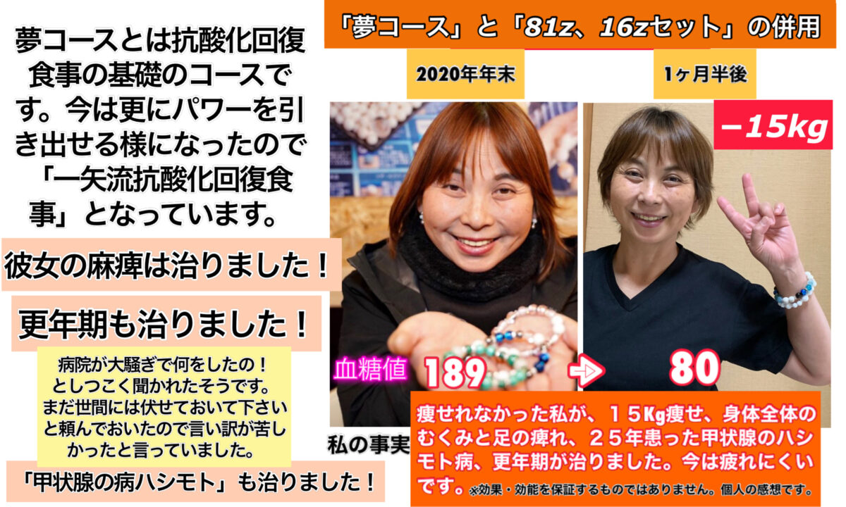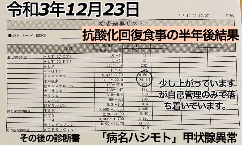 カテゴリー 結果データ 結果データh 甲状腺の病ハシモト、更年期、麻痺「抗酸化回復食事」 投稿者 作成者: kousankashokuji 投稿日 2022年9月13日 ↑この病院の診断結果は、抗酸化回復食事で治った半年後の検査結果であります。 この半年間は、抗酸化回復食事を食べずに、一般食事で自分管理の元の結果です。 ← 結果データg 帯状疱疹「(旧)抗酸化回復食事」「アレルギーZ」 → 結果データi 血糖値・酸化改善・美白「KDスープ10gのみ)」