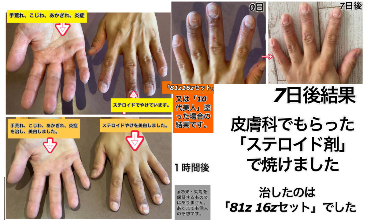 カテゴリー 手荒れ・赤ギレ・ステロイド焼け 結果データ 結果データZ 赤ギレ、手荒れ 、抗生物質、ステロイド焼け「81Z・16Zセット」 投稿者 作成者: kousankashokuji 投稿日 2022年9月13日 ステロイド焼けには、すぐ「81Z」!! 通常の火傷も同じ速度で同じ結果。(重度の火傷は、やり方が違います。) ← 結果データY アトピー性皮膚炎「81Z・16Zセット」 → 結果データa 血糖値管理・ダイエット、痩身「(旧)抗酸化回復食事」「グリーンZ」「クッキーZ」