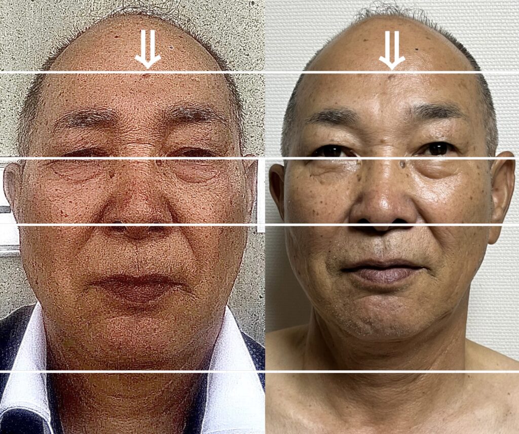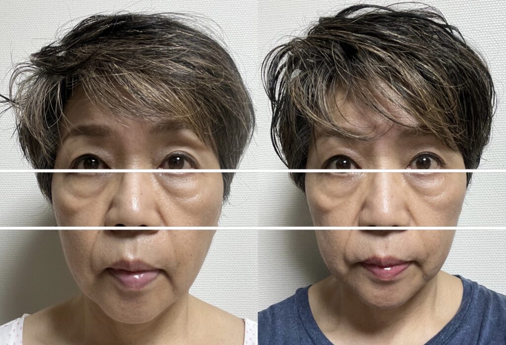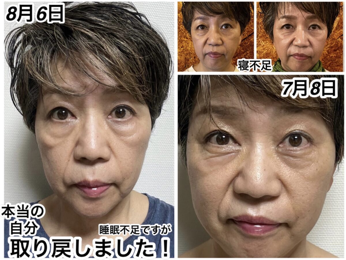 本当の自分を取り戻しましたね〜。本当にこの方はキャリアウーマンで、常に寝不足のまま若返りを果たしました。寝不足でも若返りできるのか!?とこちらが驚いております。なので目の下に若返ってもだんだんがあります。