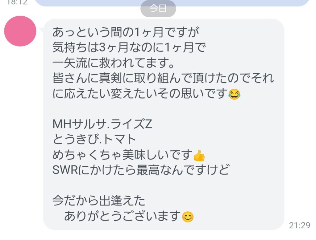 以前よりも視力が回復していると思われますが、いかがでしょうか?全身すべてがよくなるように、特にこの2 、3日からさらに追加しました「MHサルサソース」「MHZサルサソース」「ライズz」の新製品は、お客様を最短で良い状態に連れて行くために開発した商品たちです。こちらも、これらを授かったおかげで、さらにいろんなことに応用が利くため嬉しく思っております。食べ方だけ間違えなければ、かなり有効活用が期待できるものたちです。この1週間でさらに激変するはずです。血液検査結果を待っております。いつもありがとうございます。