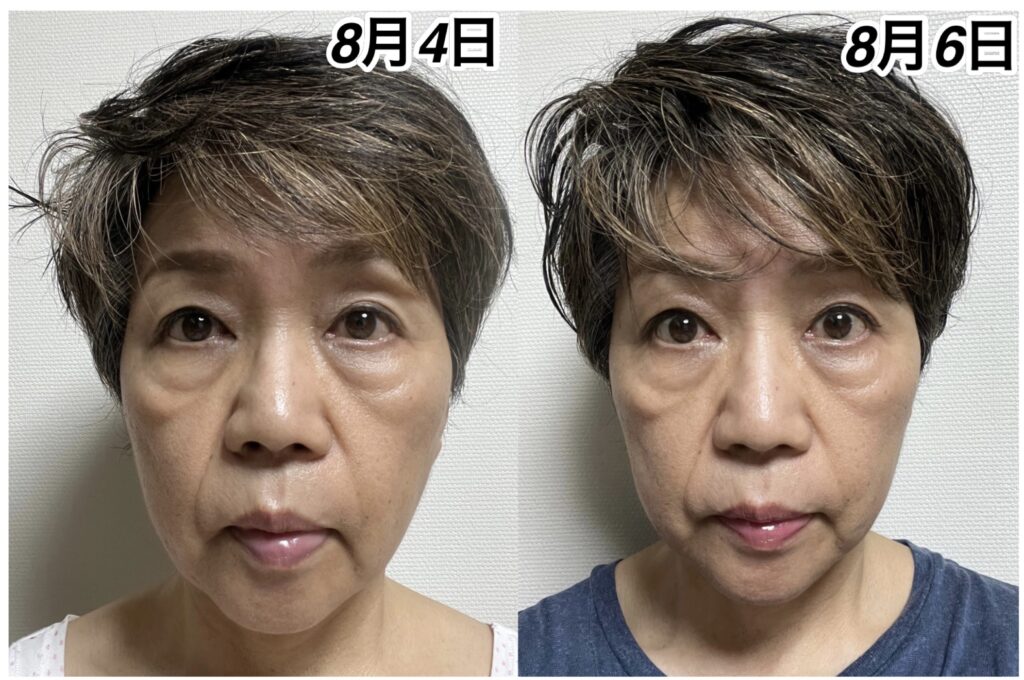 8月6日の写真の目尻を見ていただくとわかりますが、顔が小さくなってしまったので、4日と比べると鼻の穴が少ししか見えなくなっているように思うでしょうが、実際はそうではありません。あまりにも全体のバランスが取れなくて、多少下げ気味にするしかありませんでした。