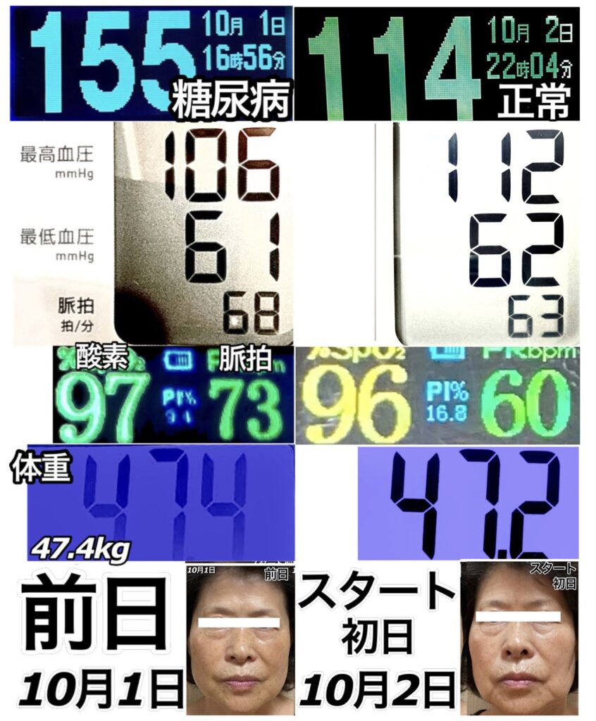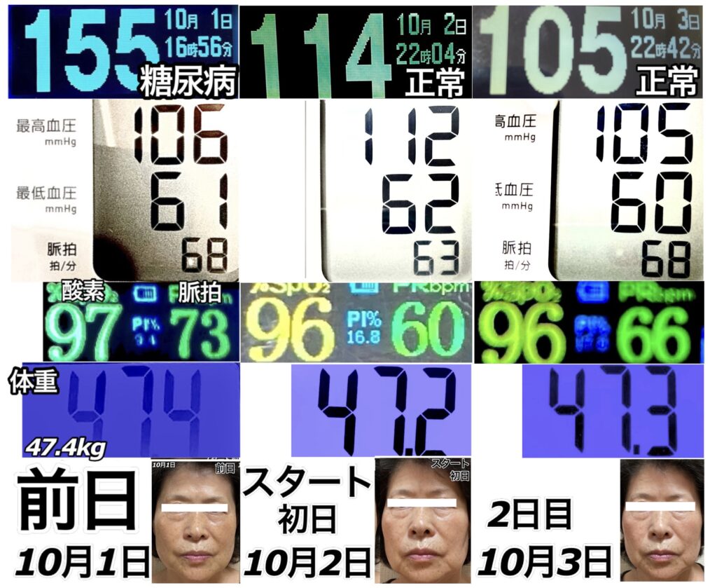 この3日間の推移で予測出来る事は、今までの日常生活で、代謝に関わる栄養素が不足している事が予測出来ました。あとは、腸内環境に必要な栄養素も不足していることも推測出来ました。コースが終わった後に、そのポイントの栄養素を気にすると大分身体が楽なはずです。もちろん酸化対策で「KDスープ」“自分g”を探し当てての抗酸化は続けた方が良いと思います。