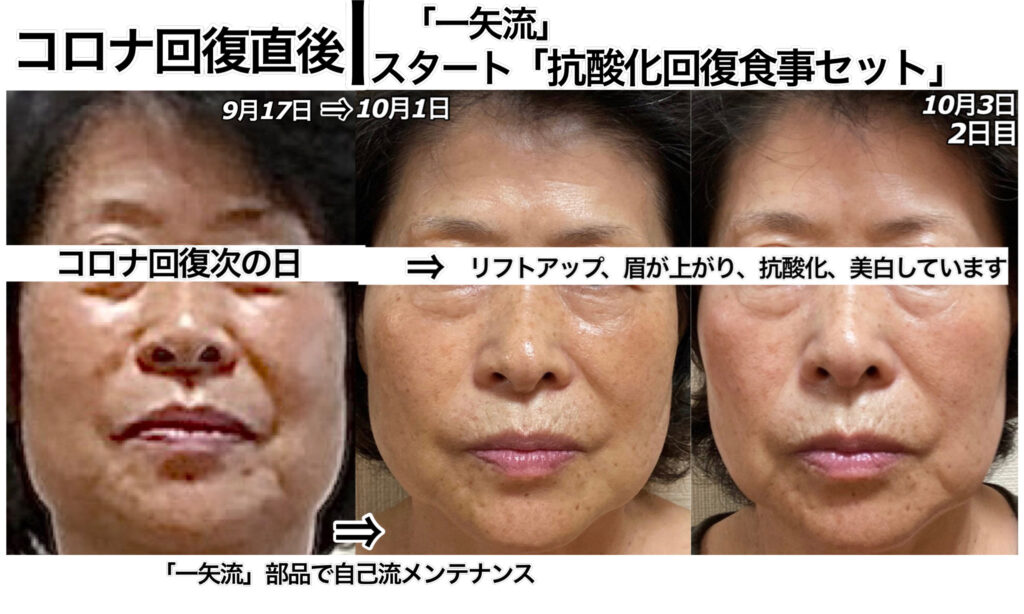 ご自分の努力と「一矢流」のお肌用の弱い部品を薄めてコツコツ、自分流メンテナンスをし続けて頂きました「可愛くて美人な常連さん」です。数日前に治った「コロナウイルス感染の後遺症」で「倦怠感、聞こえづらい、目のカスミ等、身体の調子が悪く、更に下半身の肉付きも気になる」との事で「抗酸化回復食事」で調子をみたいとの事でした。が、やはりかなり酸化に負け始めていました。抗酸化回復食事が終わった後は、「KDスープ」で「自分g」(10g前後?)を見つけて酸化を打消して頂ければかなり良い状態を維持出来るはずです。コロナと戦った後なので栄養不足は確実です。一度栄養不足をリセットすると段違いに色々体感できます。ただ今体感中!リアルタイムで情報をお届けしております。