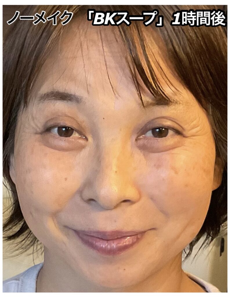 1時間後の抗酸化された爽やかな状態です。1時間前までは酸化していたので酸化は老化で炎症です。炎症を繰り返すと発ガンになります。とりあえず爽やかな状態に美肌で美白もした抗酸化が見て取れるので危険な状態から遠くなりました。酸化をしている事が病気を招き入れる事であり、全ての病気の必須条件になります。彼女の場合は代謝が良かった為にすぐに顕著な結果に繋がっています。代謝が悪い方でも抗酸化すると代謝がよくなり、美白・美肌・毛穴が目立たないもちもち肌に数十分から変化が始まり1日あれば変わっています。これが「一矢流 抗酸化回復食事」メインスープである「BKスープ 1日分の25%である80g」の実力になります(「KDスープ」に置き換えた場合は、100gが同等品です)。これを数日繰り返すと抗酸化が内臓まで行き渡り、姿形が若返るのと同時に調子の悪いところが一気に改善されていきます。人は各内臓が若返る事により、足の先から頭のてっぺんまで(当然お顔もそうですが)、同じように比例して若返ります。美しく若返りたい場合は、各内臓に阻害なく栄養素を行き渡らせる事、スムーズな代謝が重要になります。それにはキチンとした栄養満点の血液が重要になります。栄養は吸収することなので吸収した後の排出も重要になります。その為には吸収兼排出の腸内環境と栄養の代謝がすべての答えになります。
