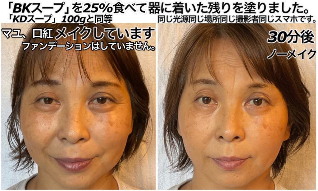 BKスープは「抗酸化回復食事」1日分の25%(80g)で、食べ終わって器についた残り分をお肌に塗って、15分後に洗い流した状態です。(「KDスープ」に換算すると100g分になります。「KDスープ」は40g入(【販売店舗お持ち帰り予想価格】 3,240円(税込))が基本になりますので、2.5個分で8100円(税込)です。