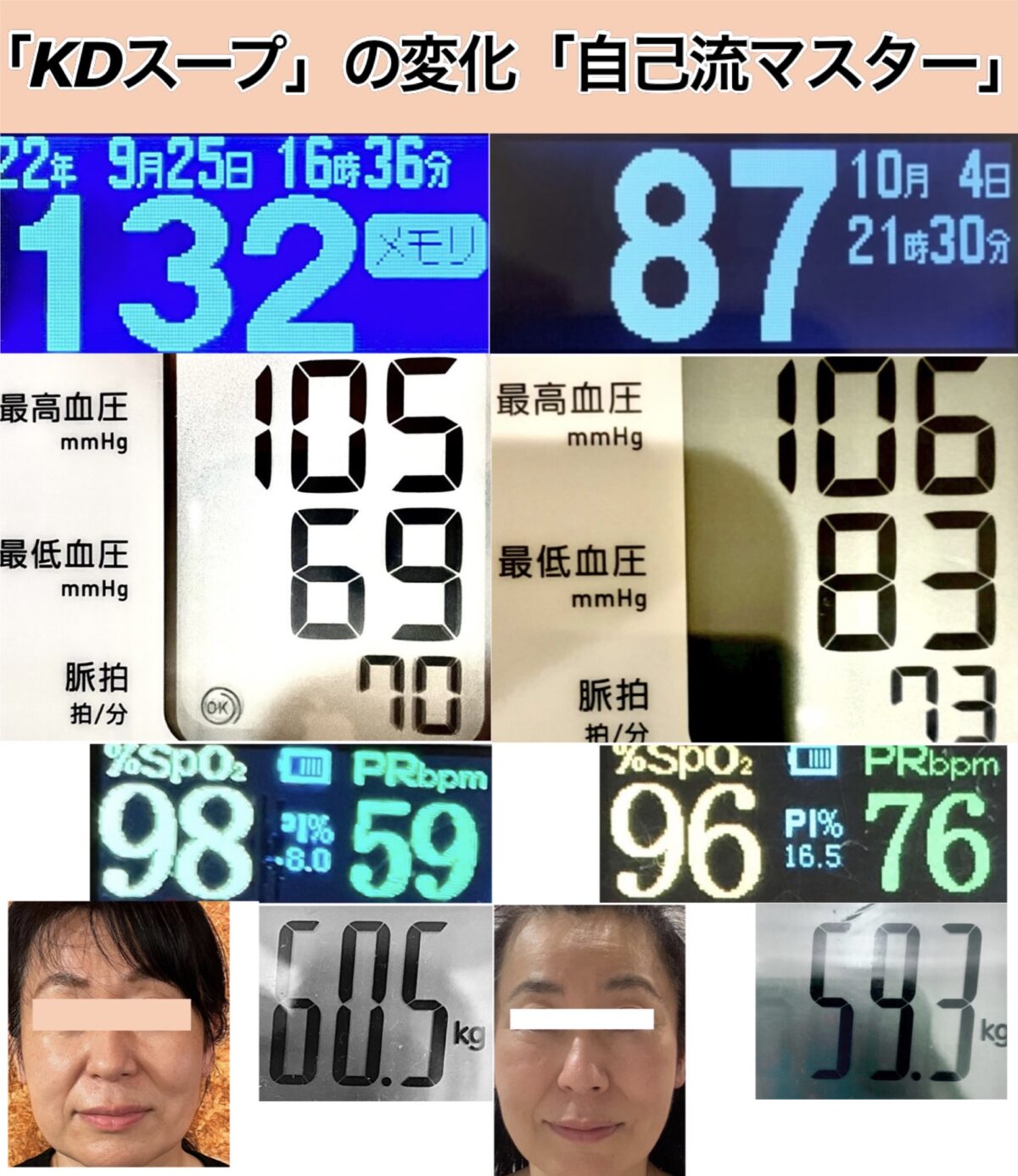 BKスープは「抗酸化回復食事」1日分の25%(80g)で、食べ終わって器についた残り分をお肌に塗って、15分後に洗い流した状態です。(「KDスープ」に換算すると100g分になります。「KDスープ」は40g入(【販売店舗お持ち帰り予想価格】 3,240円(税込))が基本になりますので、2.5個分で8100円(税込)です。