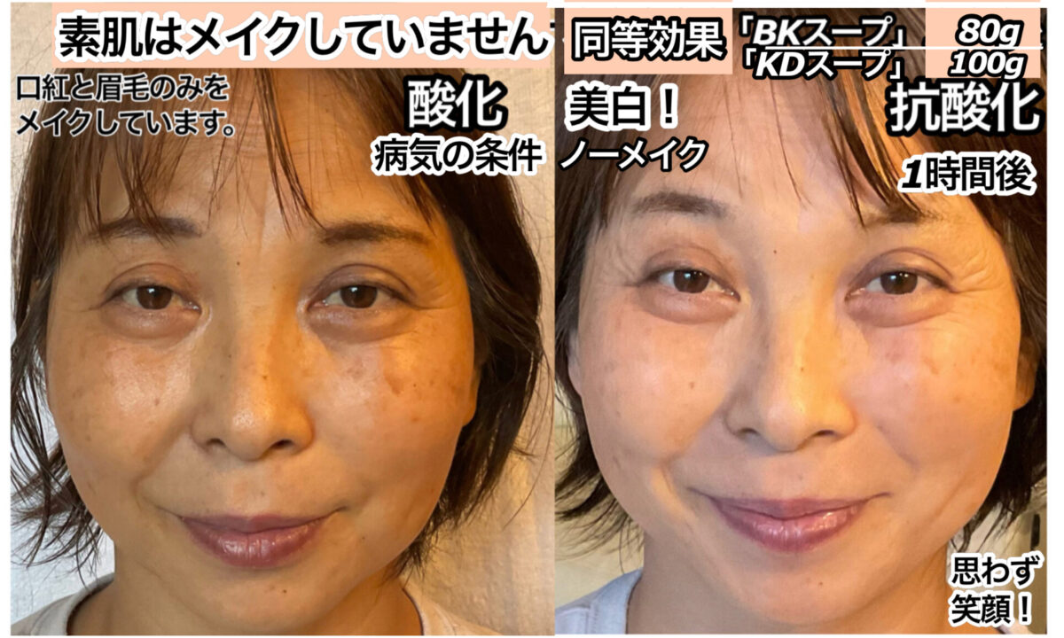 1時間後の抗酸化された爽やかな状態です。1時間前までは酸化していたので酸化は老化で炎症です。炎症を繰り返すと発ガンになります。とりあえず爽やかな状態に美肌で美白もした抗酸化が見て取れるので危険な状態から遠くなりました。酸化をしている事が病気を招き入れる事であり、全ての病気の必須条件になります。彼女の場合は代謝が良かった為にすぐに顕著な結果に繋がっています。代謝が悪い方でも抗酸化すると代謝がよくなり、美白・美肌・毛穴が目立たないもちもち肌に数十分から変化が始まり1日あれば変わっています。これが「一矢流 抗酸化回復食事」メインスープである「BKスープ 1日分の25%である80g」の実力になります(「KDスープ」に置き換えた場合は、100gが同等品です)。これを数日繰り返すと抗酸化が内臓まで行き渡り、姿形が若返るのと同時に調子の悪いところが一気に改善されていきます。人は各内臓が若返る事により、足の先から頭のてっぺんまで(当然お顔もそうですが)、同じように比例して若返ります。美しく若返りたい場合は、各内臓に阻害なく栄養素を行き渡らせる事、スムーズな代謝が重要になります。それにはキチンとした栄養満点の血液が重要になります。栄養は吸収することなので吸収した後の排出も重要になります。その為には吸収兼排出の腸内環境と栄養の代謝がすべての答えになります。