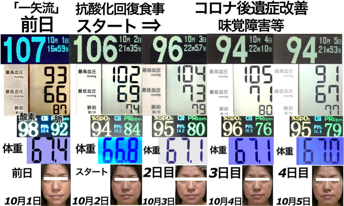 結果データo コロナ後遺症 味覚障害、倦怠感、視界の悪さ、腰痛 症状改善、全身のコリ・ハリ、むくみ、頭痛・頭のモヤモヤ、胃や背中痛みとハリ「美容・回復・ダイエット・血圧・脈拍」、全同時攻略「一矢流」「抗酸化回復食事セット」食べるだけの挑戦リアルタイム・ドキュメント5日間[4日目]