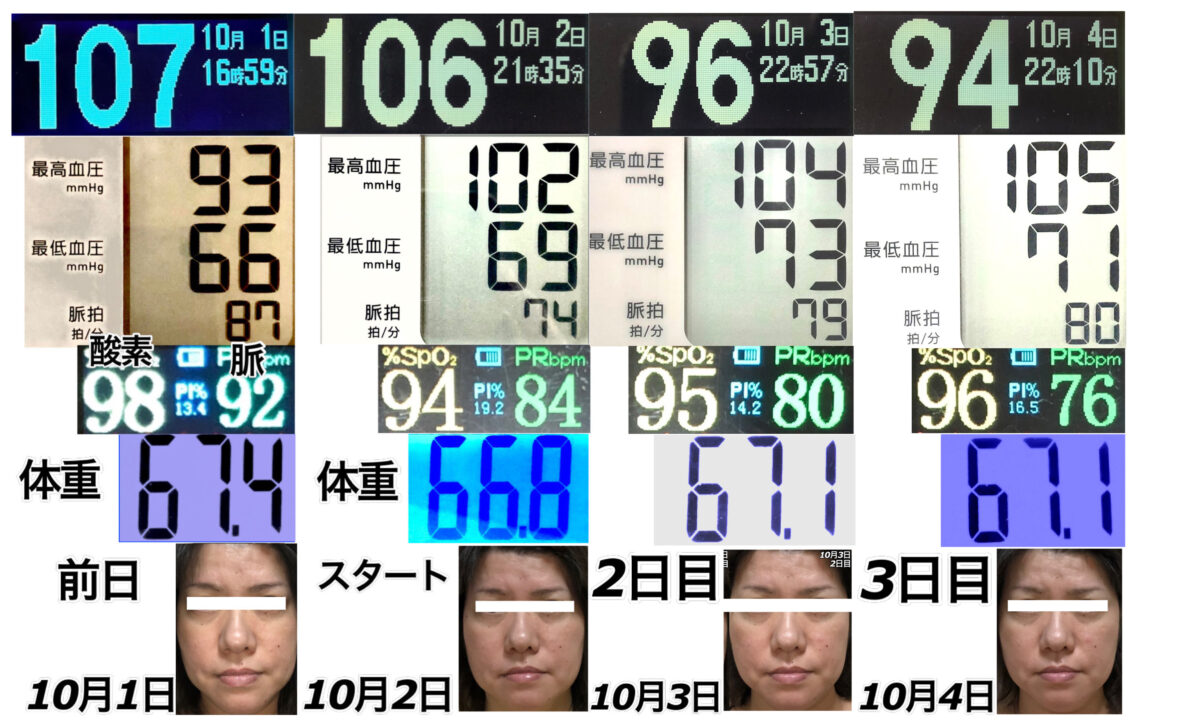 明日の食事を食べ終わる頃には、肩こり・腰痛、その他・頻尿もかなり緩和されていて、ある程度は快適に変わっているはずです。体重の減り具合から予測出来る事は、かなり状態が良いという事が判断つきます。酸素が99じゃないので、少し気になりますが、多分長年蓄積された重金属ではないかと推測されます。
