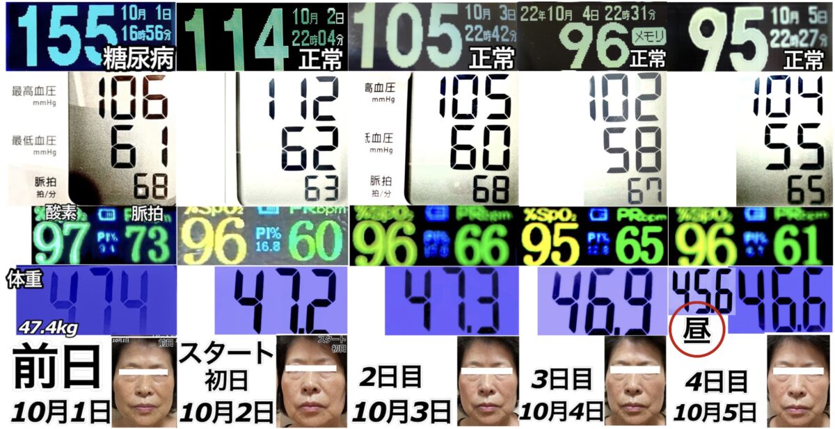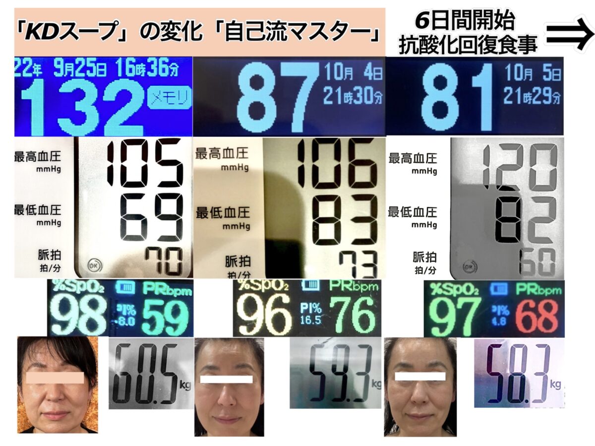 結果データp「71歳・コロナ後遺症 症状改善」・「軽度糖尿病 改善」・「美容・回復・ダイエット・血圧・脈拍」、全同時攻略「一矢流」「抗酸化回復食事セット」食べるだけの挑戦リアルタイム・ドキュメント6日間スタート[4日目]