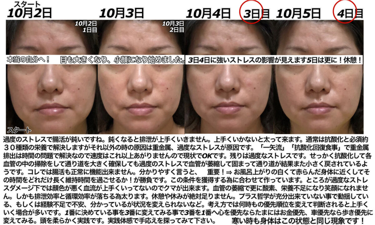 結果、抗酸化はかなり良い感じで進んでいる事は明らかなので、更に栄養素も取り込んでいるのも明らか。最初始める時の初日の顔色と悩みが目のクマだったので、推測されるのは、休憩不足・睡眠不足。