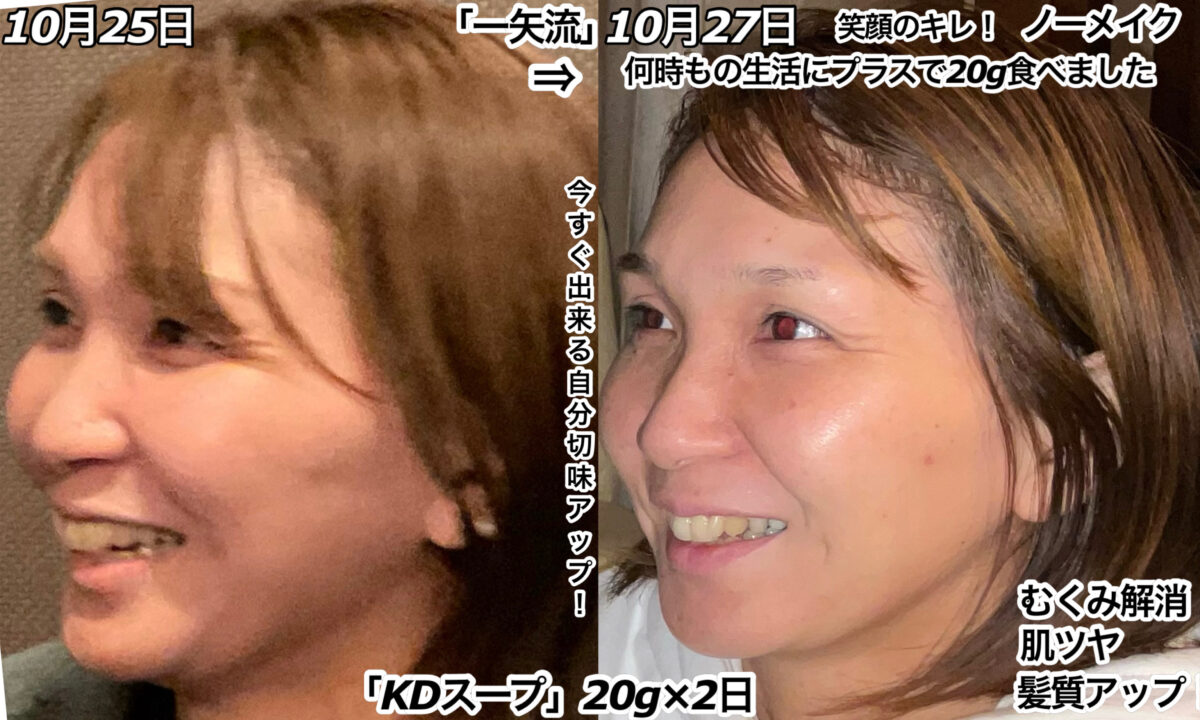 この「KDスープ」の使い方は、かなり有効度が高いと思います。まず1日目の時点で、測っていませんが血糖値が正常化しています。抗酸化で阻害がある程度解除されている為、“むくみ・肌ツヤ・髪質”が本来の状態に戻ってきました。結婚式やデートの前、証明写真を撮る前など、勝負の少し前等にこの使い方で「美人度のキレ」を増しましょう!いい事しかありません!