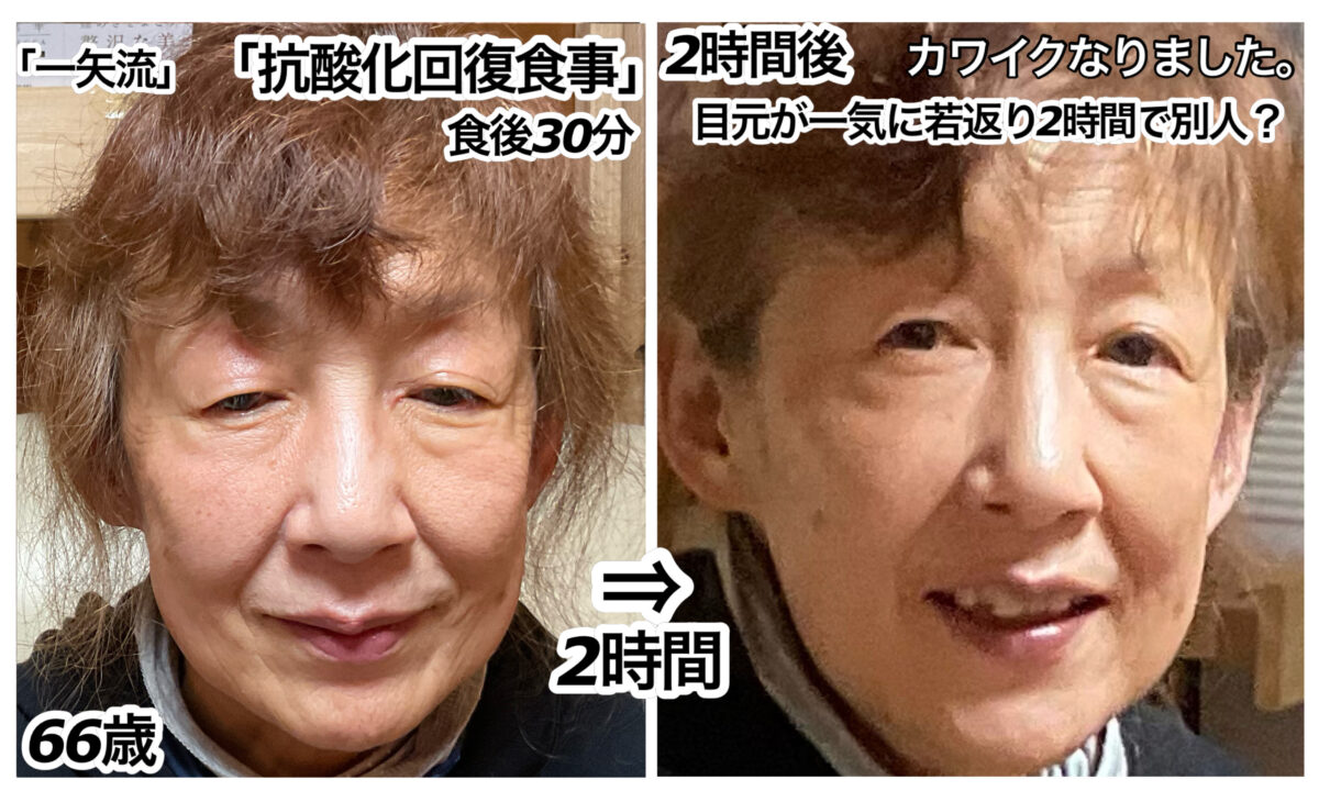 髪の毛の質と色が尋常じゃない変化をしています。完全な栄養素必須約30種類「一矢流」を摂るだけで、数日でここまで変わります。この髪の毛の変わり方で分かる事は、髪は「血余」ともいい、大切な内臓達に行き渡った後、最後に余った血液の栄養が髪の毛に充填される仕組みなので、すでに各内臓器官には栄養が行き渡った事が示された結果です。内臓に栄養が行き渡っていない身体の方は、髪の毛がバロメーターになります。パサパサ・ボサボサ、白髪、コシが無く、ツヤが無い、または枝毛、薄毛、ハゲ。この状態の時、栄養不足が明らかなので、病気の条件が揃っている身体の環境になります。直ちに栄養充填を計りましょう。栄養充填が済むと、上記の様な髪質の変化が起こり、健康的に美しく若返り美人になります。