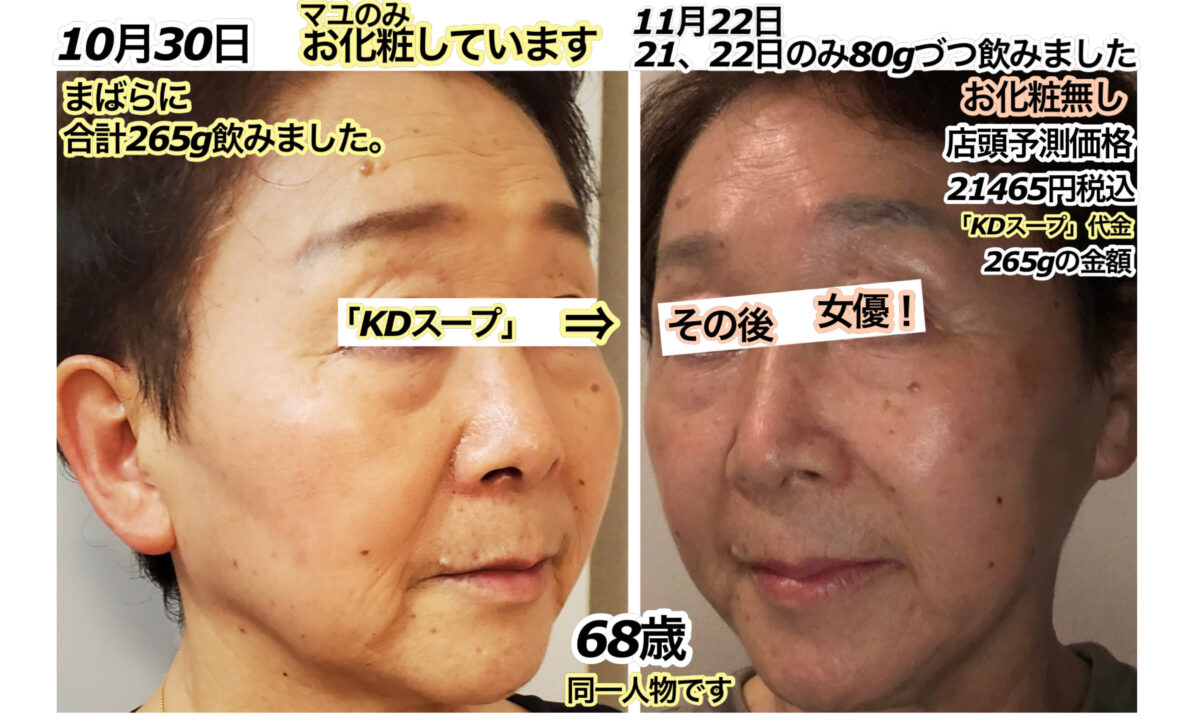 他の人から見ると、間違いなく別人に映ります。ご本人様が1番ご承知でしょうが。もうすぐ70歳になるとは思えない美形です。逆にファンが集まり過ぎて、大変かもしれません。奥さん確か映画の「極道の妻」に出演していませんでしたか?と聞きたくなる様な、和服が似合う美人さんです。この状態を維持するのは、「KDスープ」の“自分g”を見つけてください。今回のように、もし美形が崩れるのを感じたり、病気などの予兆で調子が悪い等ありましたら、「KDスープ」を1日80gずつを何日か食べることで、一気に解決できる身体である事が分かりました。13gを食べていた状態が良さそうな感じですが、ご自分でも色々試してみて下さい。もともとの代謝がうまくいっているようです。血糖値も問題なかったので、今までの生活習慣にプラスで「KDスープ」の“自分g”を追加する事で、抗酸化も良い状態になります。抗酸化がいい状態になると、毒素の排出能力が向上され、身体各所の目詰まりや阻害が無くなり、栄養素が行き渡り、炎症が起こりにくくなります。さらに、悪玉コレステロールも流動して排出されるようになる為に、毛穴は小さくなり、汚れにくく、内臓脂肪も減っていき、素肌が柔らかくモチモチになって行き、いい事だらけです!よって病気から一気に遠くなる事が出来ます。美人さんのままこれからも健康を維持して下さい。