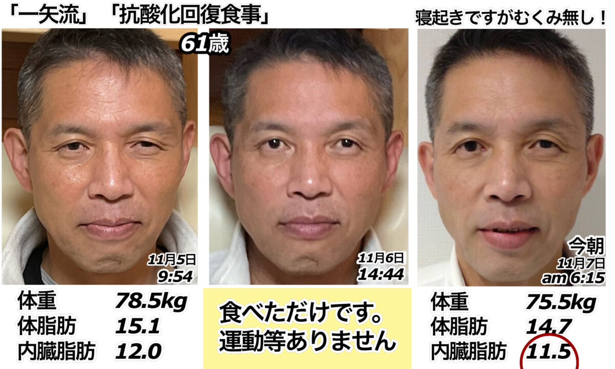 筋力はほぼ変わらず維持したままの状態で痩せております。完全に3人の別人がそこにおられます。本当の自分の姿。気に入って頂けたでしょうか?白髪が日々黒髪へ変化していくプロセスでもあります。ストレスで栄養素を使い過ぎれば、30分や1時間でまた白髪へ戻ります。最初にお渡ししました説明書に書いてあります栄養素必須約30種類を今後気にしてみて下さい。もし説明書がお手元に見当たらなかった場合は、原材料名は消えていますが、重要事項説明の下の方に掲載してあります。(今回はレベル4なので、そちらを指標にしてみて下さい。)頭の良い方なので理解が早く、もう把握されていると思われますが念のため。