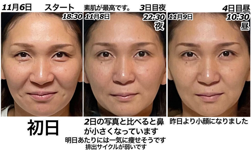 顔での変化でしか写真では分かりませんが、色々な激変が起こっています。まず写真で分かりやすい事は、おでことアゴの位置で合わせてあるにも関わらず、耳の位置が変わっています。これは、頭皮がたるんでいたものが引き締まった結果、耳の周りも若返って、耳が本来ある位置に戻った為に位置が上がりました。なので、斜め横などから見ると正面からよりも分かるでしょう。肌ツヤもスベスベのまま痩せています。たるみもなく、小顔になっています。下の写真の初日のおでこと右側のおでこを比べて見てください。実は、酸化した顔では脂ぎっている為、テカリが強いです。プラス、むくんでいて面積が広くなり、毛穴一つ一つにコレステロールが溜まっている為、この最悪な状態を支え続けます。抗酸化する事により、コレステロールが排出されて、毛穴一つ一つからも排出され、むくみがとれ、おでこが少し狭くなります。これで、ハゲて見えるか見えないかの差が生まれます。その差が顕著に出ている写真が下の右側と左側になります。