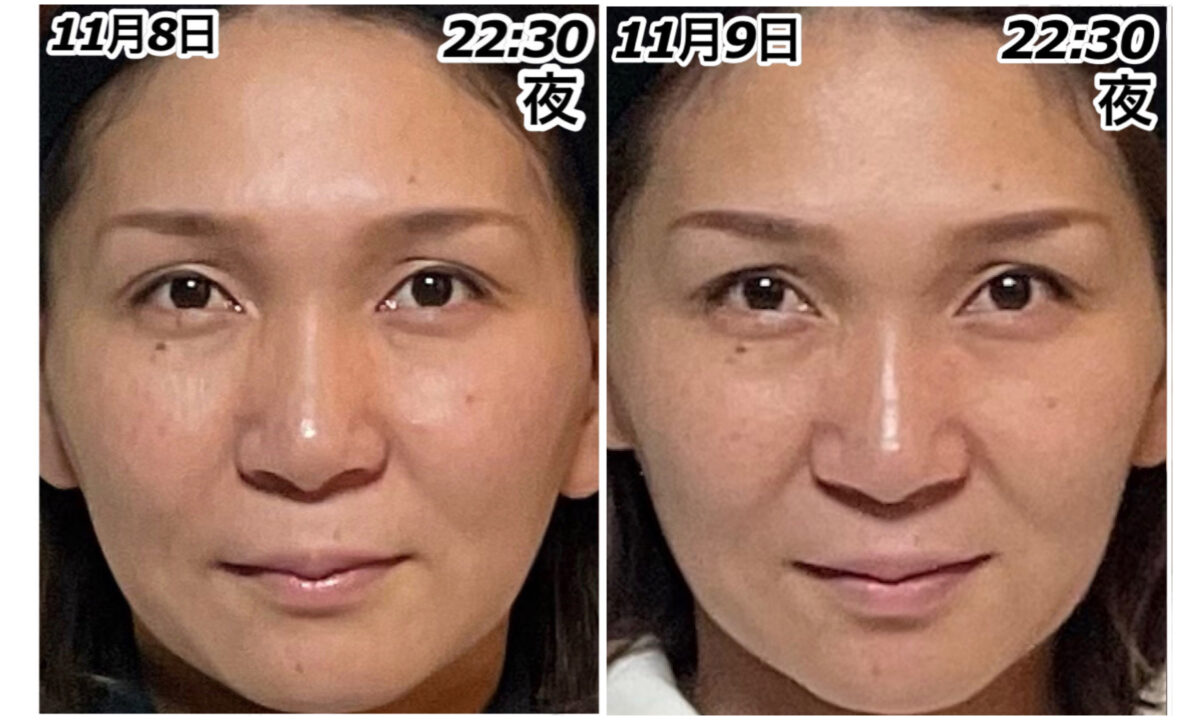 顔での変化でしか写真では分かりませんが、色々な激変が起こっています。まず写真で分かりやすい事は、おでことアゴの位置で合わせてあるにも関わらず、耳の位置が変わっています。これは、頭皮がたるんでいたものが引き締まった結果、耳の周りも若返って、耳が本来ある位置に戻った為に位置が上がりました。なので、斜め横などから見ると正面からよりも分かるでしょう。肌ツヤもスベスベのまま痩せています。たるみもなく、小顔になっています。下の写真の初日のおでこと右側のおでこを比べて見てください。実は、酸化した顔では脂ぎっている為、テカリが強いです。プラス、むくんでいて面積が広くなり、毛穴一つ一つにコレステロールが溜まっている為、この最悪な状態を支え続けます。抗酸化する事により、コレステロールが排出されて、毛穴一つ一つからも排出され、むくみがとれ、おでこが少し狭くなります。これで、ハゲて見えるか見えないかの差が生まれます。その差が顕著に出ている写真が下の右側と左側になります。