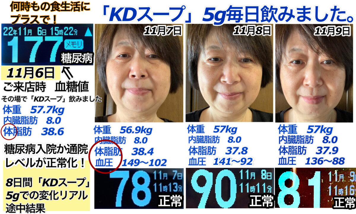 彼女の場合は、11月6日のご来店時にKDスープを飲んで頂いたのですが、1時間半前に飲んでからの食後の血糖値測定が177になります。(この場合は、140以上が糖尿病。詳細説明はこちらをお読みください。) 7日からは、食後3時間後の血糖値で測定しています。糖尿病協会の指標では、3時間後は空腹時血糖にあたり、126以下であれば正常範囲とされていますので、正常に戻り、安定しています。この状態を続けていれば、問題なく日常生活を過ごせます。減りづらい体脂肪の変化を見てください。38.6➡︎37.9へ減っています。血圧の方も高めですが、149〜102➡︎136〜88への3日間での変化が見て取れます。いずれも数日でいい方向へ向かっています。