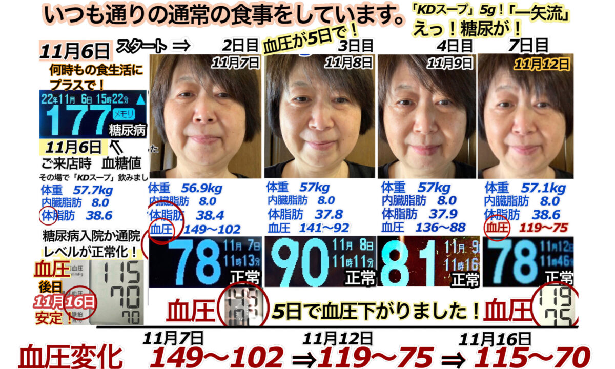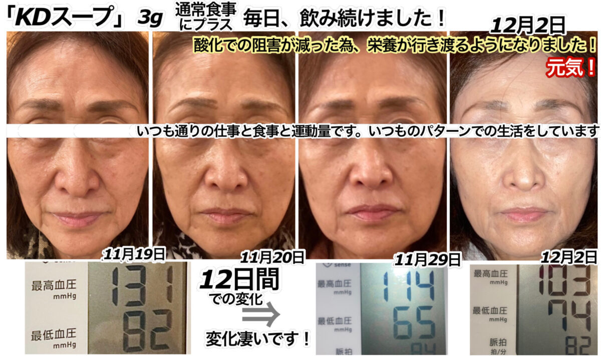 本来は8日間のトライでしたが、ご本人様からのご報告により、いつもの食事事情では無くなってしまった為、今回はここまでのデータで終わりになります。この通常ではない変化データも許容数値内ですが、説明が伝わりにくい為、今回は省かせて頂きます。ご本人様が気にされていた血圧は、5日間で正常範囲になり、改善されました。糖尿病の方も、かなり優秀な血糖数値なのでこのままであれば病院へ行ったり、薬を飲んだりしなくても、日常生活を通常通り送れます。健康体の人の理想的な血糖値の推移といえましょう。体重もそれぞれのパラメーターもいつも通り推移しているようです。それでも少し小顔になっているのには驚きました!目もパッチリ開き、浮腫が多少緩和されているのが分かります。いつもより、髪質も上がっているように見てとれます。時間がほぼ同じなので、場所も同じで光もほぼ同じと考えた場合、完全にもともと白いお肌ですが、美白され、抗酸化が多少されているように見てとれます。この状態であれば、日常生活、不便も不自由もなく、身体も多少軽いはずです。血圧がこれだけ下がると悪玉コレステロールたちが、血液や血管の中から、一時排除された事が分かります。引き続き暴飲暴食をなさらずに、健康的にお過ごし下さい。今回は少し長い期間でしたがありがとうございました。データのやり取り等、慣れない作業の中、ご負担をおかけ致しましてご苦労様でした。ありがとうございました。
