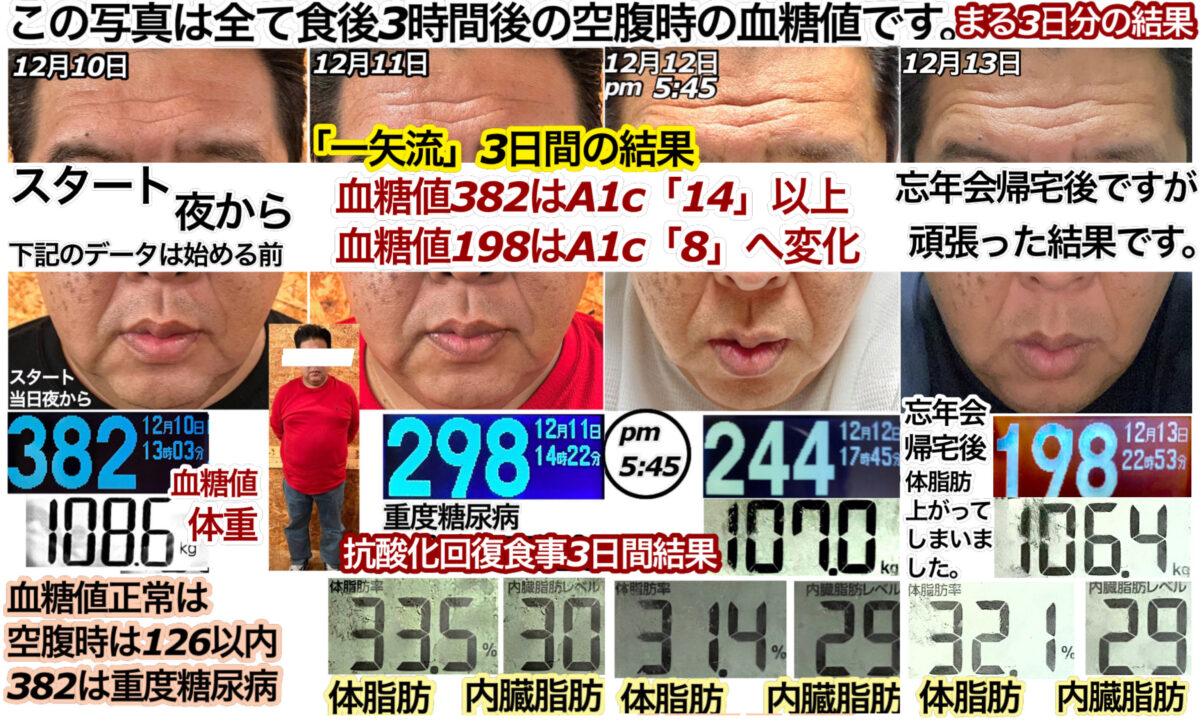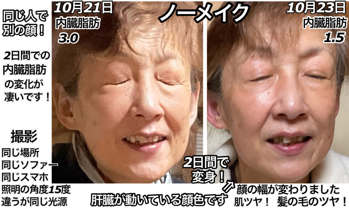 この数値を良くご覧頂けると、4日間分の食事にも関わらず、驚異的な結果がプロセスとしてもお分かり頂けると思います。理想的なダイエットであり、回復・若返り、全て同時に行い通常痩せる時の皮あまり現象にはならず、若返っている事が証明されています。写真と照らし合わせながら確認していただけると、ありえない理想がそこにあります。特に、内臓脂肪は体重が減っても絶対に減らないものです。美容のプロの方なら、誰もが夢見る現実がここにあります。この結果と金額のリーズナブルさを体感して下さい。酸素の行き渡り方が97〜99%の方で、脈拍が85前後くらいの方なら、この驚異的な状態結果に、誰でもこの日数で辿り着く場合が多いです。それ以外の方は、実は慢性疾患完全予備軍か病気の人に当たるので、回復の方に力が注がれる為、ここまでの変化は日数がかかる場合がございます。回復食事をしている最中に、身体はすこぶる調子が良くなっていく為、いつもより無理が効きます。無理が効くからと言って、今までのご本人の通常生活以上の運動する方は、この限りではありません。コツは、今まで通りいつも通りに過ごして頂けると、より良い結果に辿り着きます。