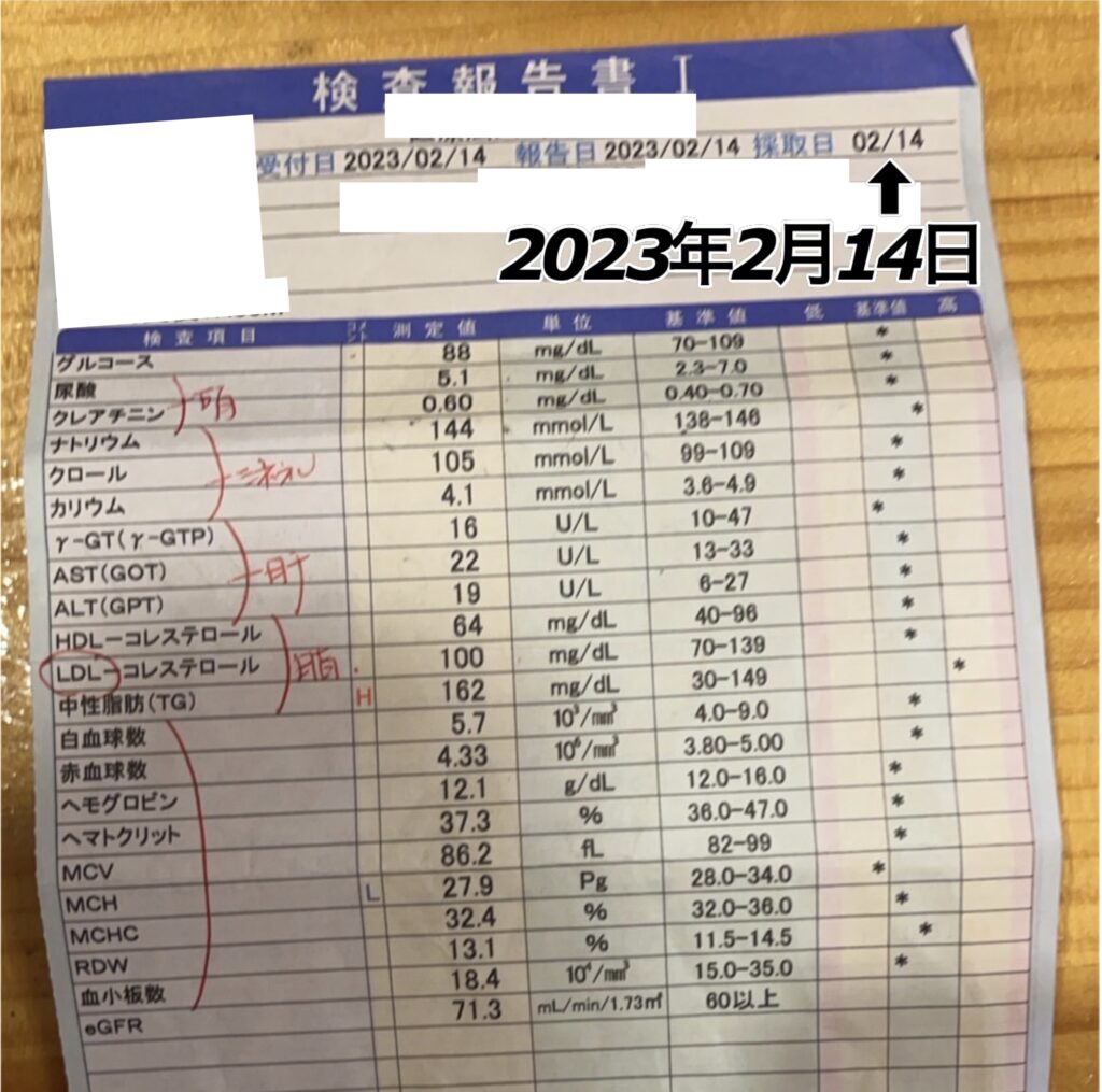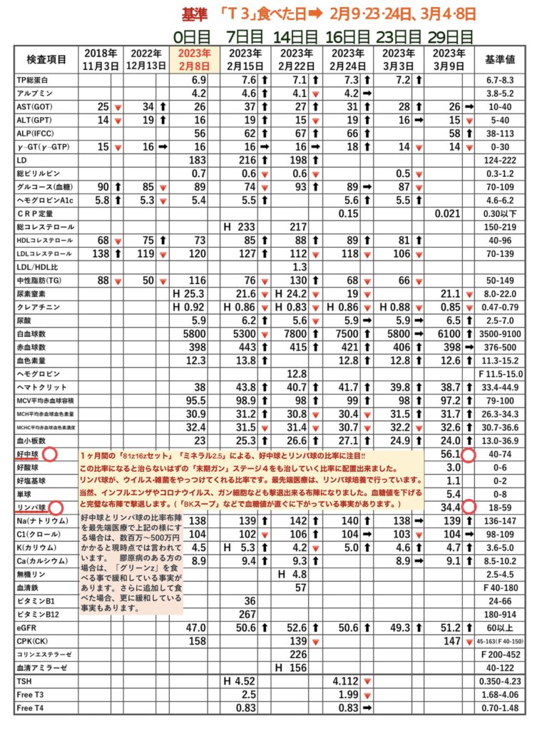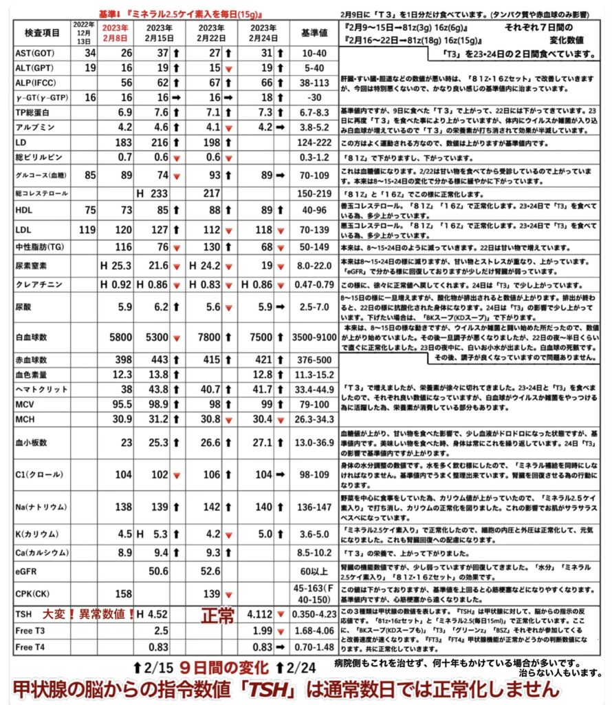 「81z 16zセット」「ミネラル2.5」を毎日。(「T3」は1ヶ月中、まばらに5日間のみ)、あとは今まで通りの(通常の)食事対応。2月22日(14日目)の血液検査結果だけは、中性脂肪を見ると分かりますが、外食の影響が出ています。