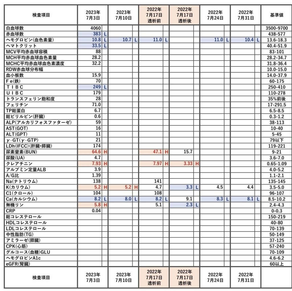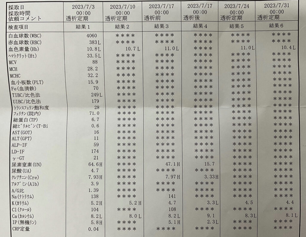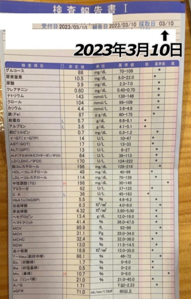 日によって血液検査結果に空欄がありますが、病院がそれぞれ違う為に検査をしてくれなかった部分が空欄になっております。全て東京都内の有名病院を含む病院たちの血液検査結果となります。