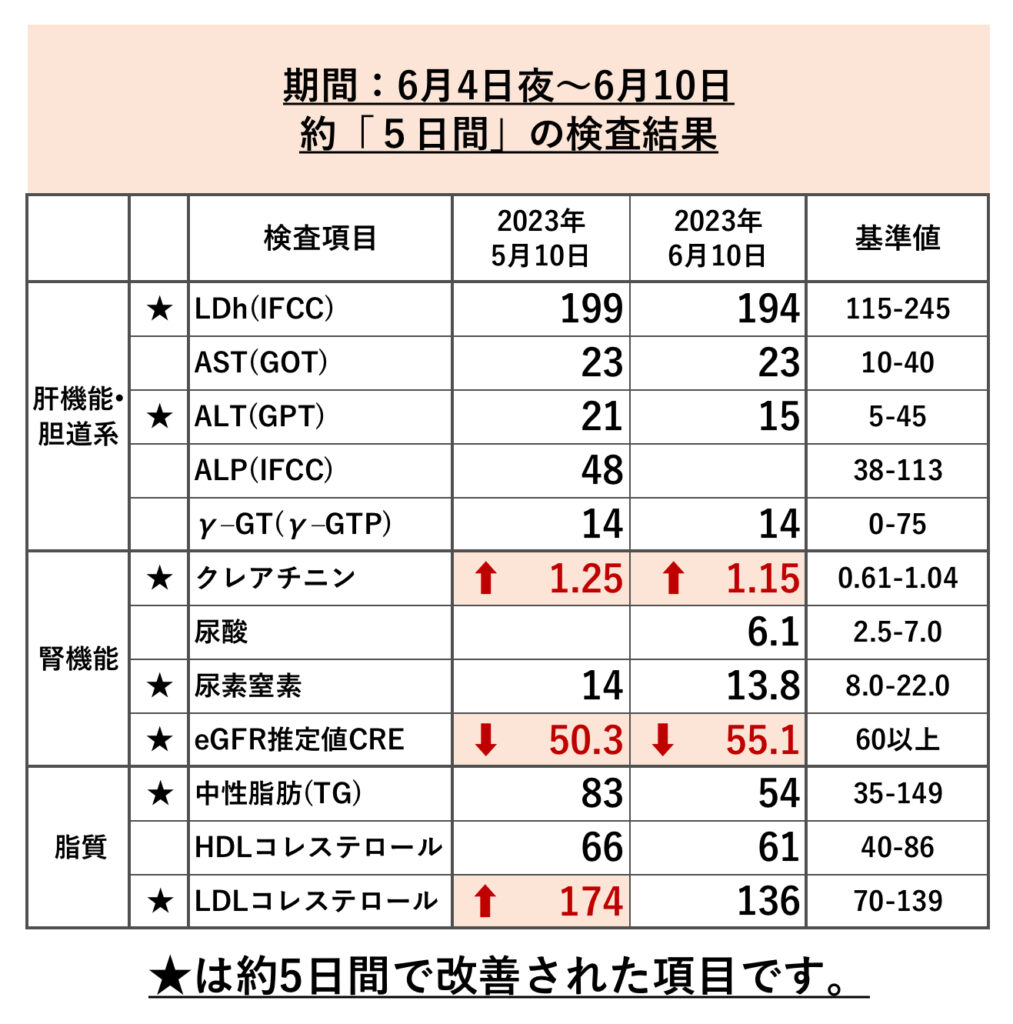 彼の場合は、腎機能の問題と脂質の布陣がおかしかったので、「一矢流 回復食事」5日間で正常化させました。その時の血液検査結果です。詳しく知りたい方はこちらをクリックしてください。➡︎【結果データ】