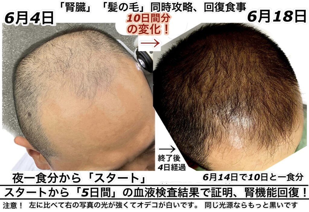 「髪」復活❗️「腎機能」「中性脂肪」同時攻略 5日間の変化「T3」髪の毛増量。1時間半の変化。➡︎『髪の毛、発芽、発毛、育毛』➕『腎臓回復』の食べるだけ同時攻略。「5日間」の血液検査結果と10日間の髪の毛の変化結果。