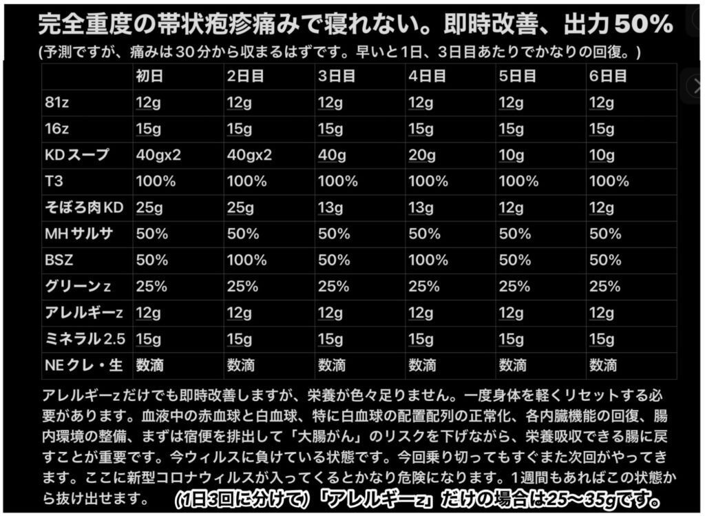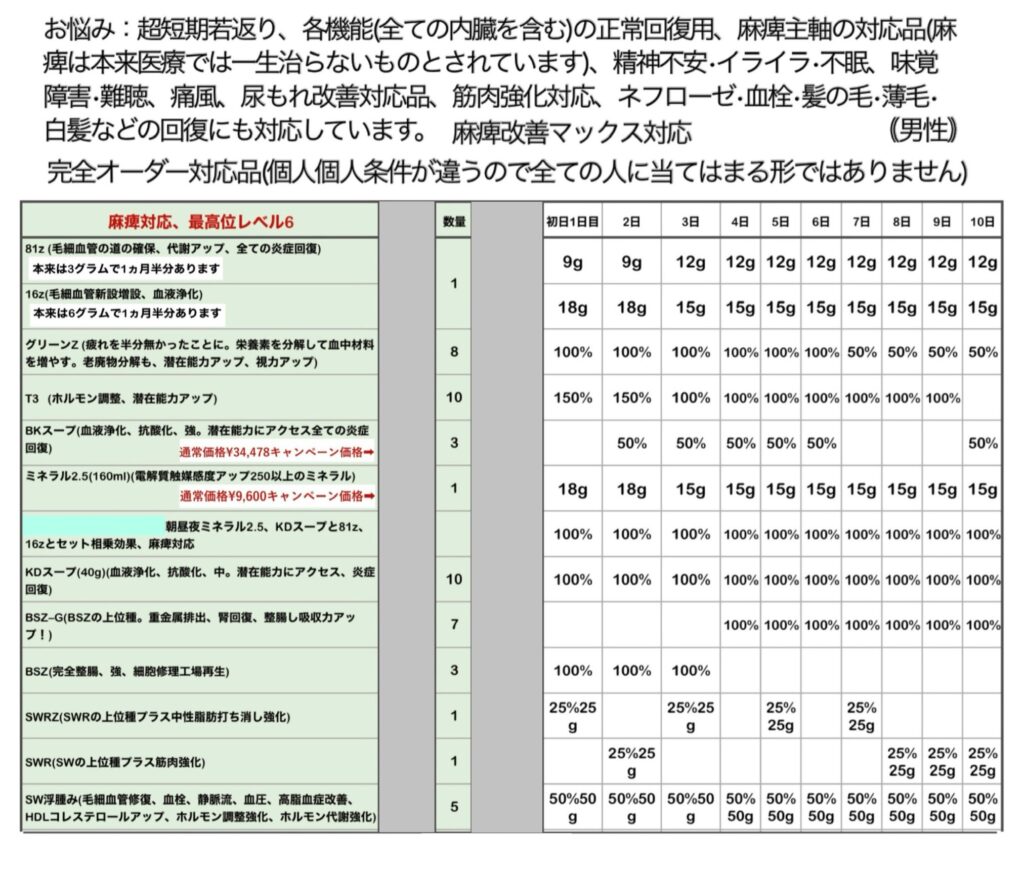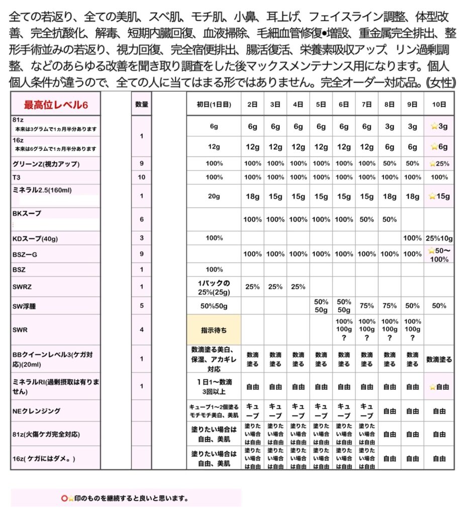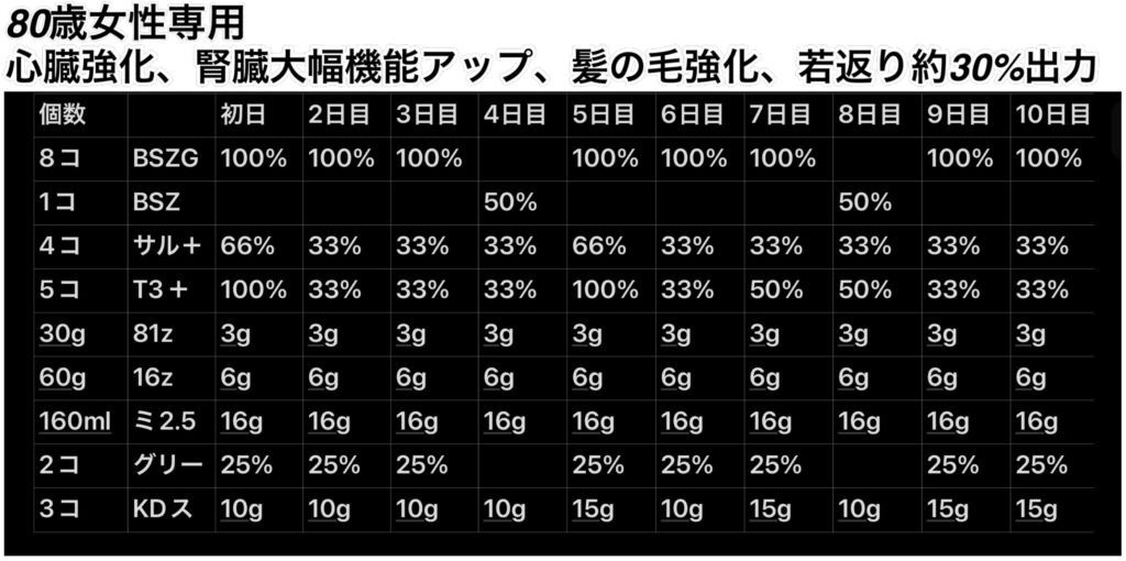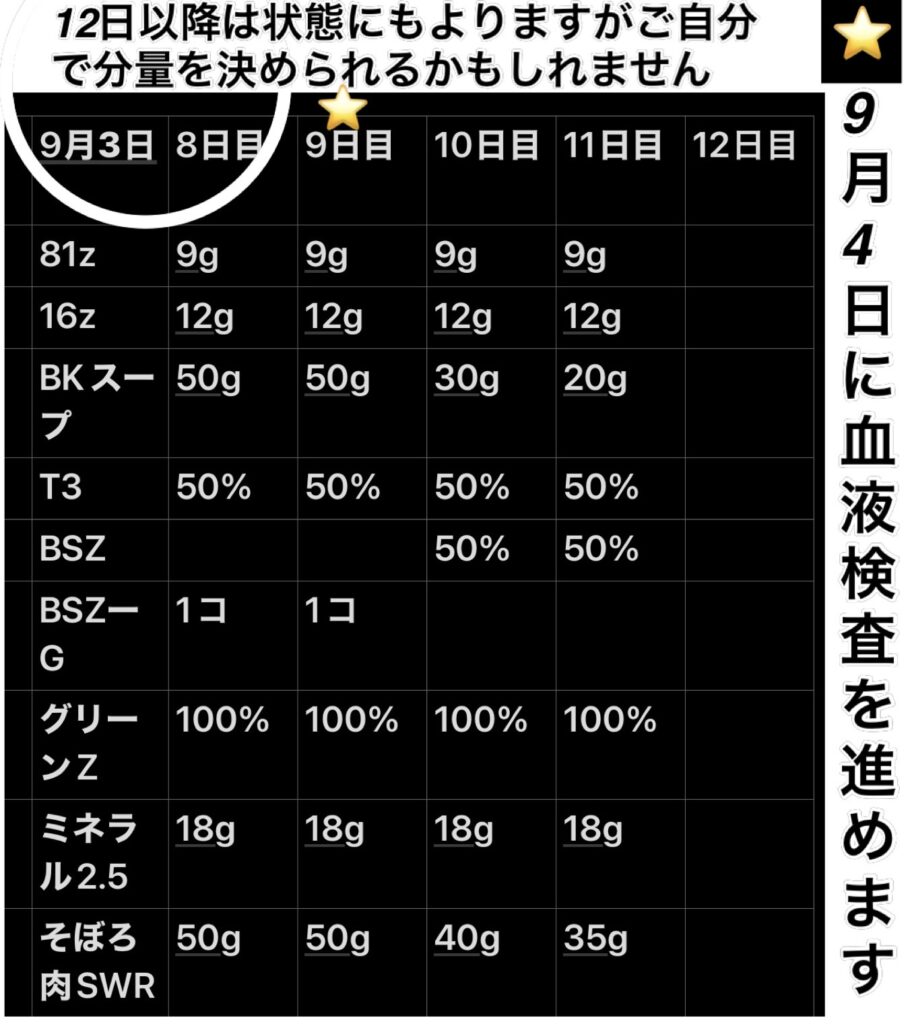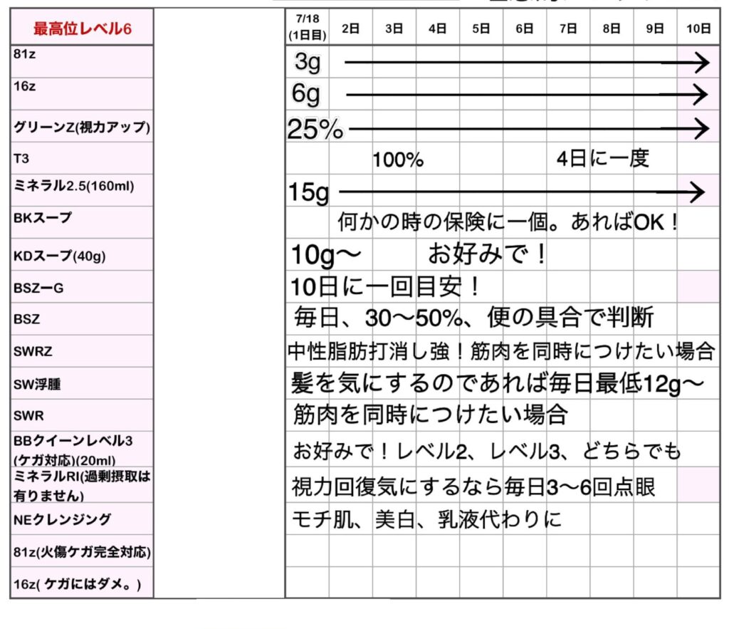 排泄がイメージ通りにならない場合は、「BSZ」を“20%”足して飲んでください。ご自身しか具合はわからないと思いますのでよろしくお願いします。「16z」は眠る直前に飲んでください。