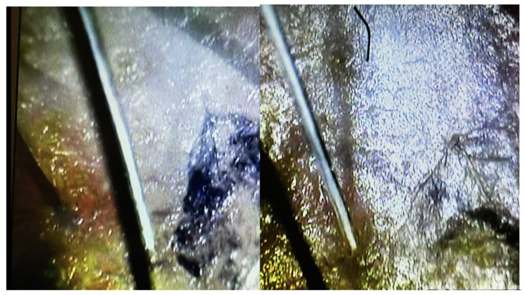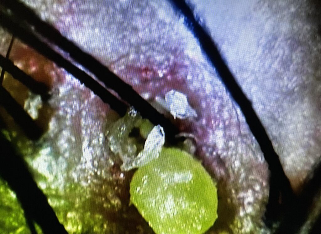 ⬆︎上の写真の「グリーンボール」は、『皮脂とホルモンの塊』のようです。さらに上の白い「もやしの天ぷら」の様な2つは、『髪の毛が芽吹く寸前の衣付き』です。