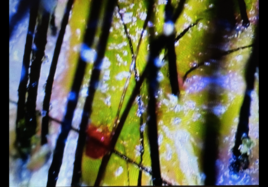 皮脂とホルモンの混合体が下の写真では丸くなっております。大抵は毛穴から半分丸いのが出ている形か、今回みたいな外側に生み出された状態でいるのは、乾燥しているか•ホルモン分泌が弱いからです。ホルモン分泌が強くなると、上の状態の様な形になり、髪の芽吹きや育毛が促進されます。