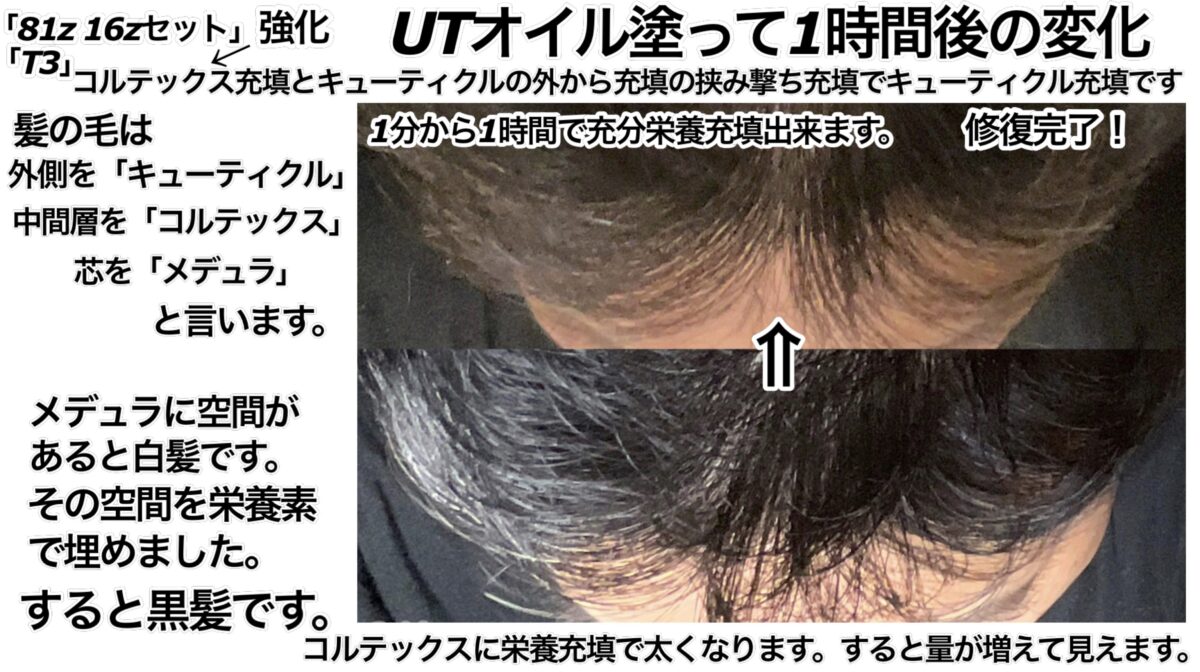 「UTオイル」のみでも白髪が緩和し、髪の毛1本1本にコシが出てきて、ふわっとボリューム感が出ています。