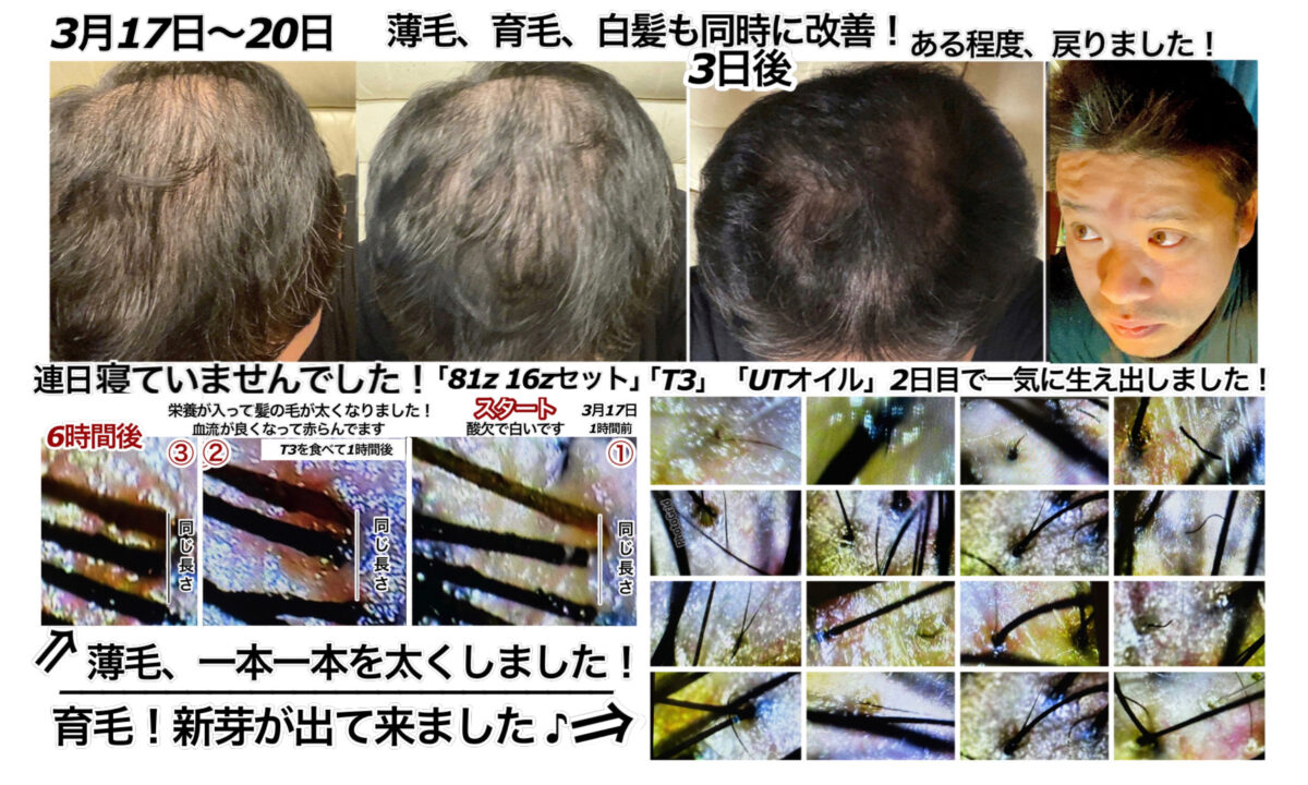 この1週間(新芽が出るまでの期間)を短くしたい場合は、「T3」「81Z•16Zセット」「ミネラル2.5」と条件を増やして行く程に、髪の新芽が1〜2日で芽吹き出します。