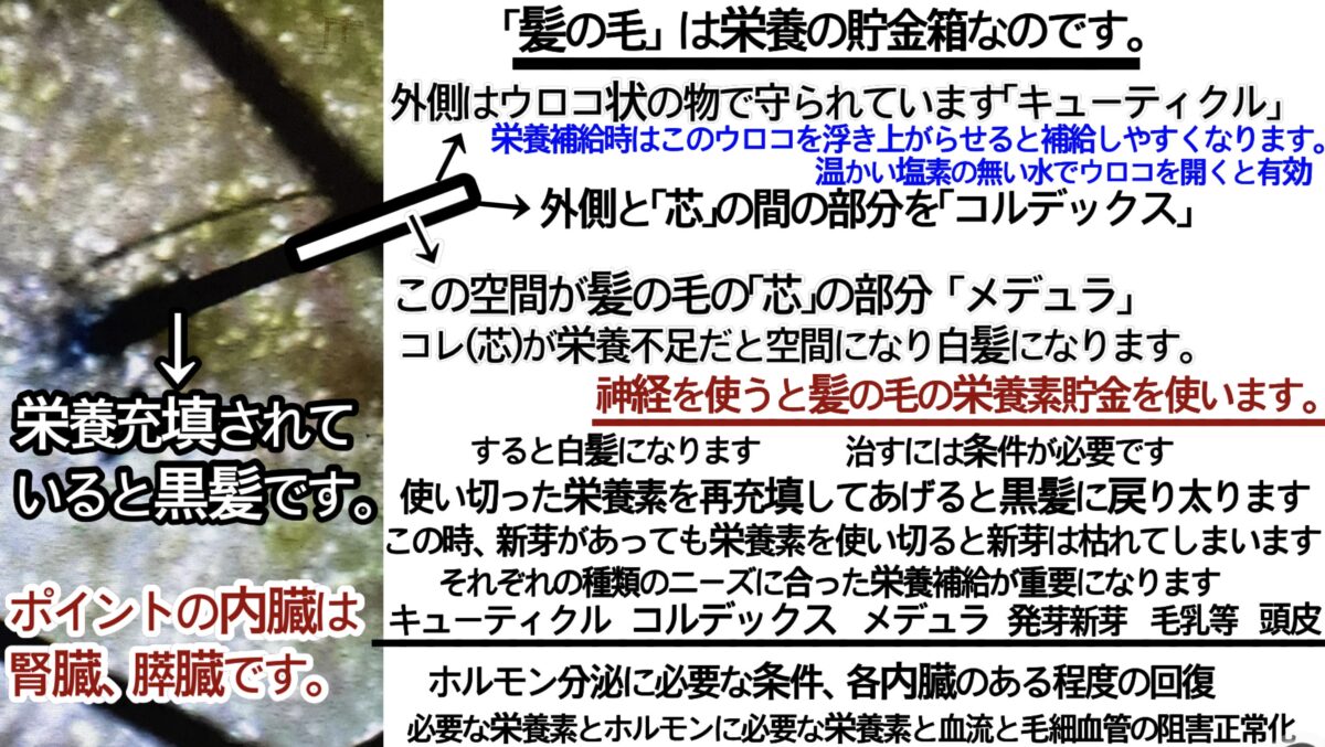 1番最後の埋没タイプの髪の毛の生え方もあるので、ある程度皮脂とホルモン分泌がされないと埋没できません。通常タイプをよく見て頂けるとわかりますが、髪の毛として立ってはいますが、埋没させている状態と同じ様に、薄い皮脂とホルモンの膜で、自身を守っています。これがないと育毛になりません。世の中の定説である、油分と脂分で肌の呼吸ができず、酸欠にというのはどうやら違うようです。内容的には逆な事がわかりました。細かく説明しませんが、血糖値管理が出来ていれば問題のない話だと思います。