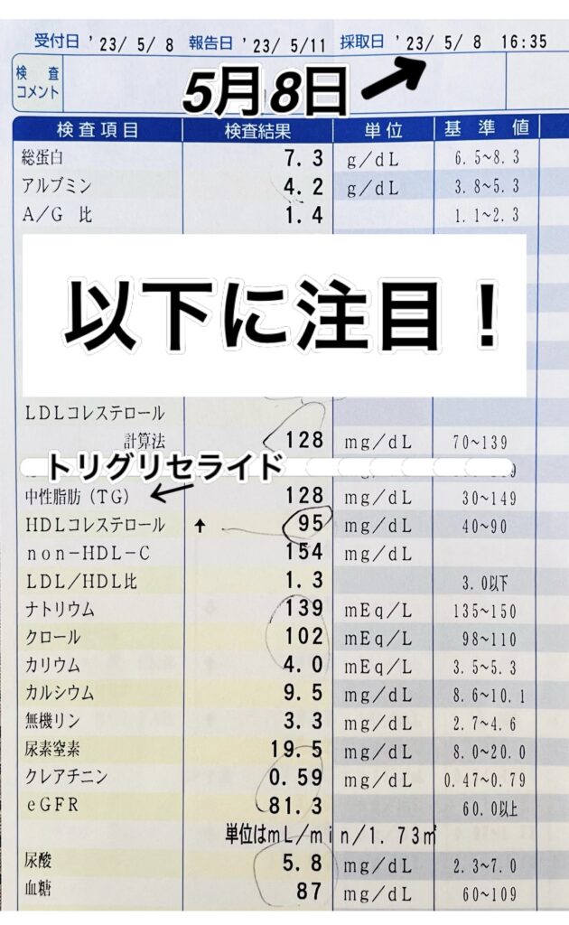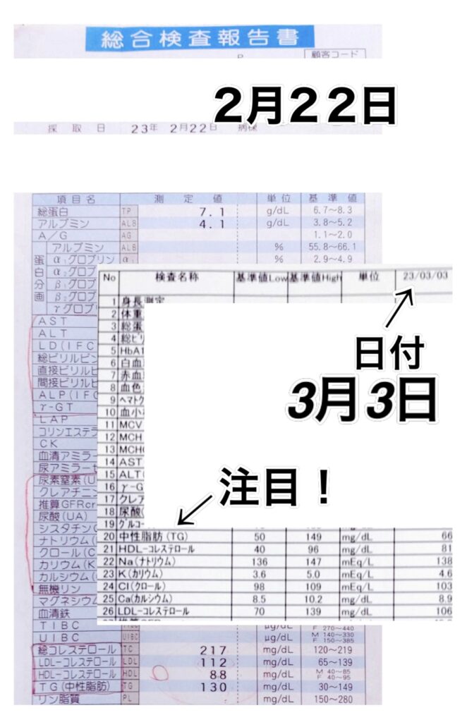 カテゴリー 結果データ 結果データBS① 5/15〜血液検査をスタート。最速は4日間で「中性脂肪128➡︎49」まで下げましたが今回は「中性脂肪139➡︎49」7日間でゆっくり下げました。 投稿者 作成者: kousankashokuji 投稿日 2023年5月30日