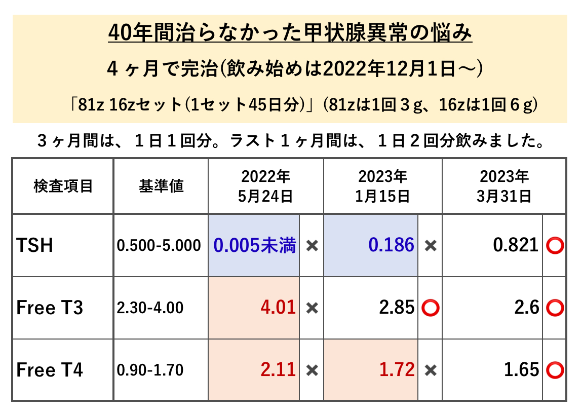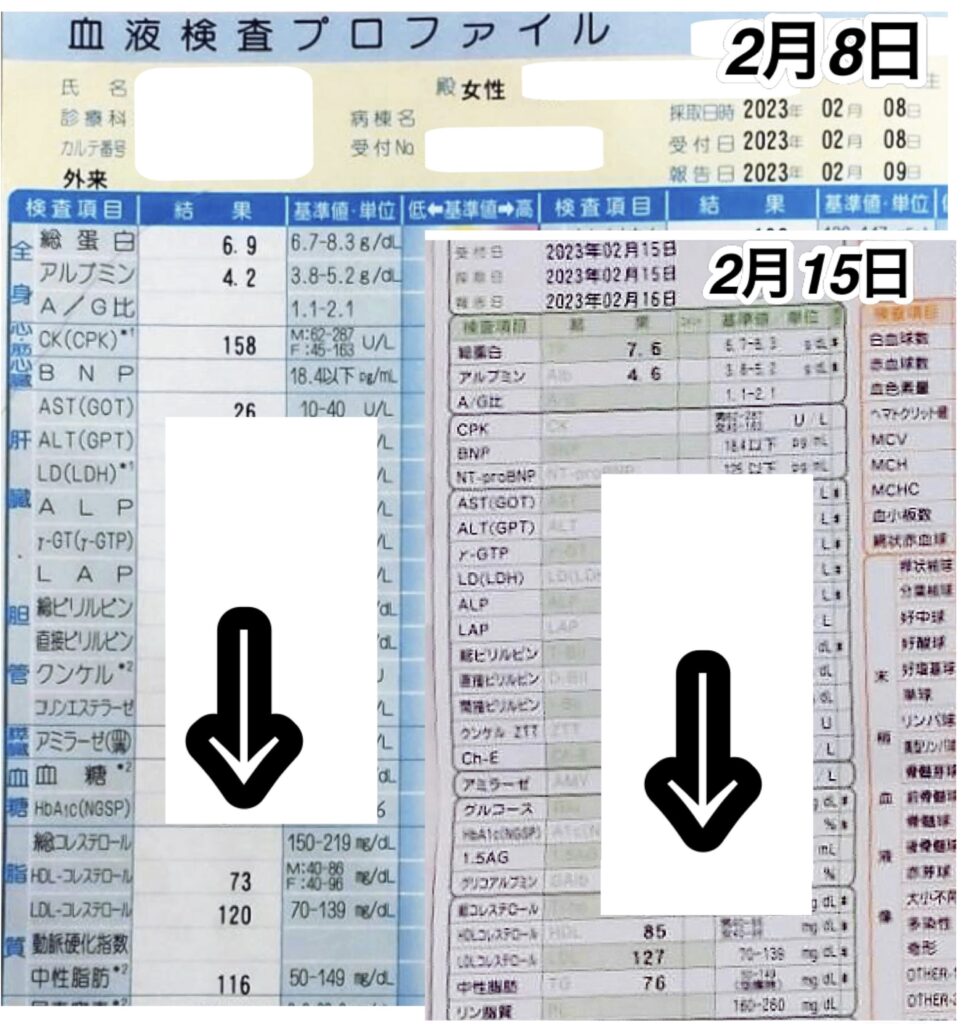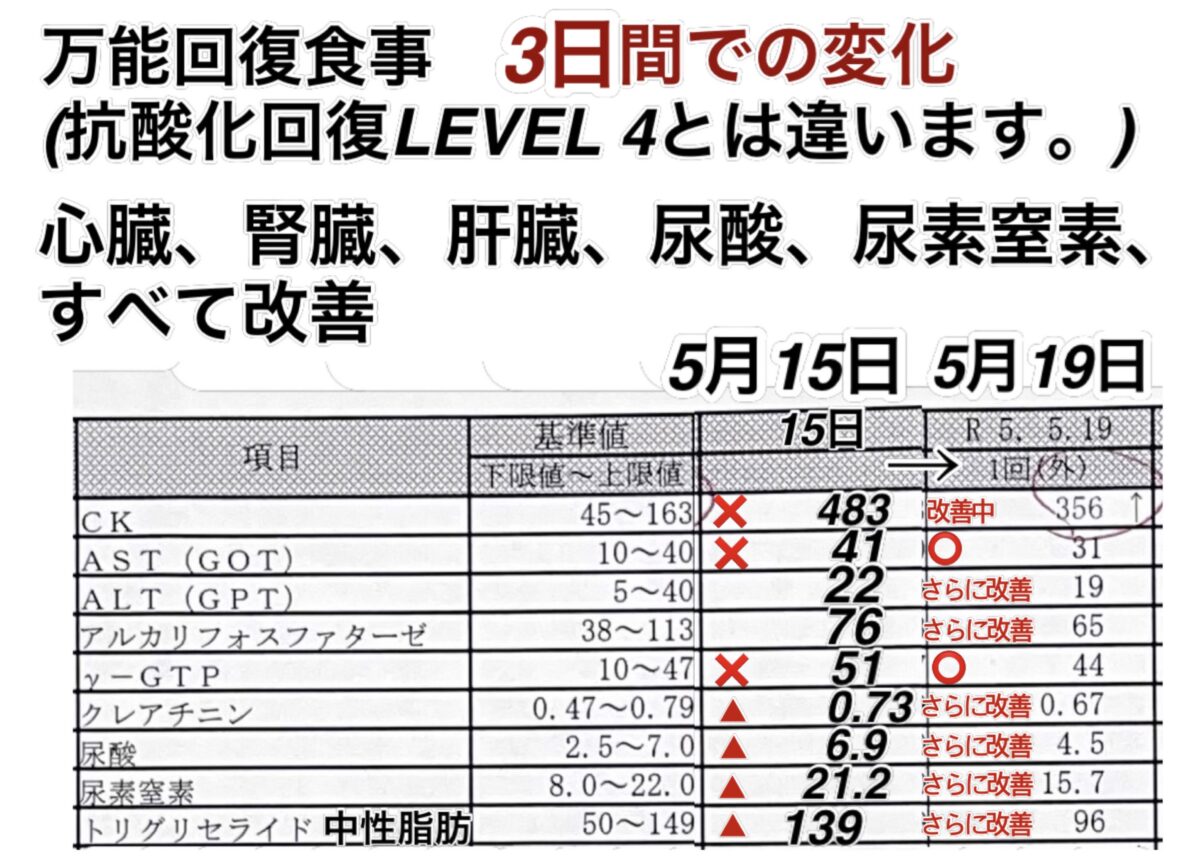 カテゴリー 結果データ 結果データBP 「そぼろ肉SWR」「ミネラル2.5」でCPK(心筋)の数値が下がってきました。 投稿者 作成者: kousankashokuji 投稿日 2023年5月19日 息苦しい状態でしたが、1日分を食べて1時間しないうちに落ち着き出しました。 毎日改善していく様が分かります。 危なかったですが良かったですね。 まだ安心出来ませんので、引き続きあと10日間くらいは摂取していただけると良い頃かと予測出来ます。 動き過ぎは厳禁です。 きちんと睡眠を取る事もおすすめです。