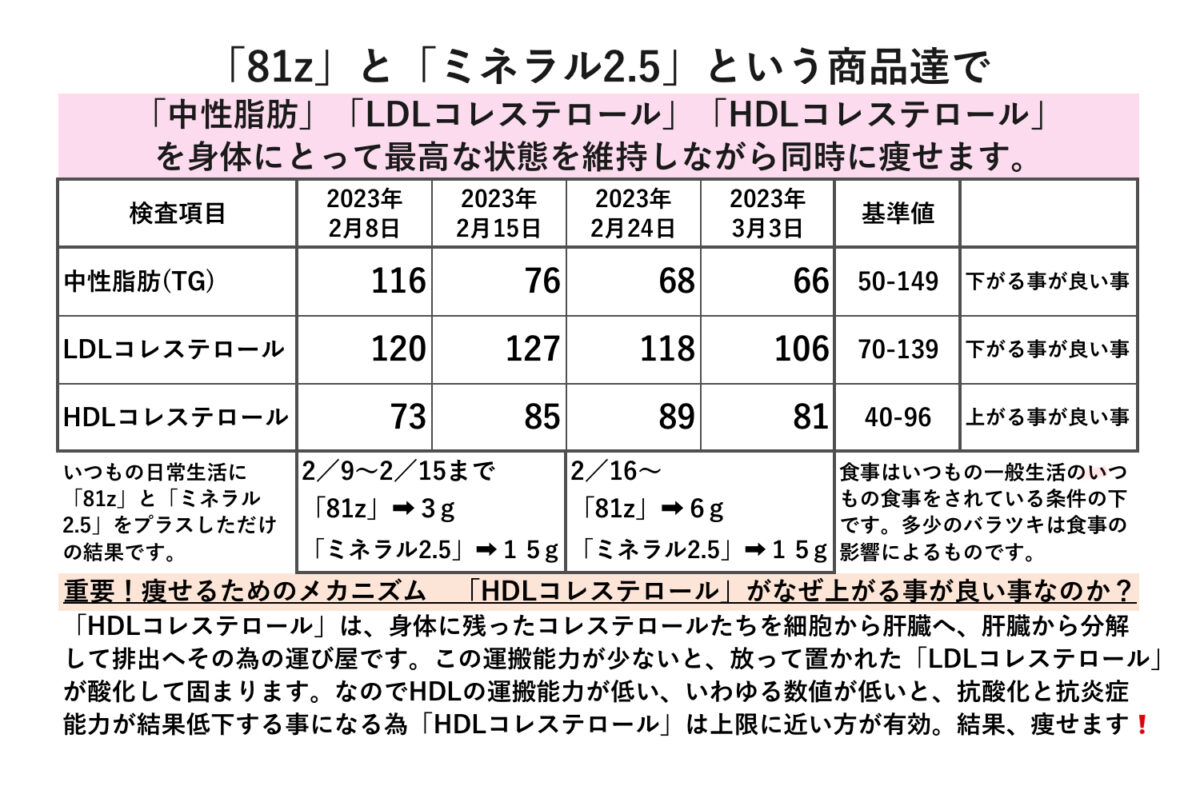 カテゴリー 結果データ 結果データBN いつもの食事に「81z」と「ミネラル2.5」をプラスで体調維持。中性脂肪とコレステロールをコントロール❗️ 投稿者 作成者: kousankashokuji 投稿日 2023年5月19日