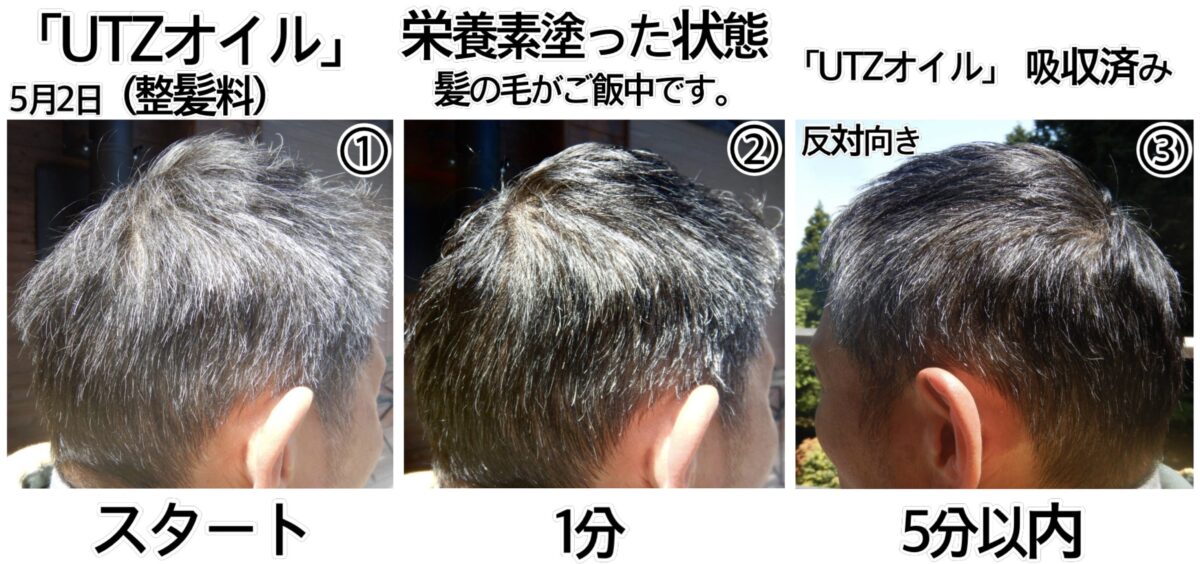自分の栄養消費を考えながら、今栄養が足りている。今栄養が足りていない。というように判断して下さい。また塗ると数秒〜3分以内には同じようにツヤ感のある黒髪に戻りますので、毎日の整髪料としてお使いいただけると、自分の無理をした度合いを把握しながらペースを作る事が出来ます。ちなみに、頭皮の発芽を強烈に促したい場合は、別商品で「UTオイル」という商品もありますのでお好みでどうぞ。
