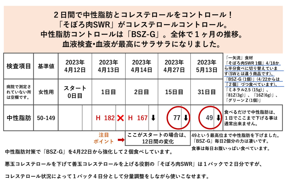 一方、血管の内壁などにくっついている脂質は、コレステロールが固まったものです。コレステロールが固まって動脈硬化が起こります。その隙間の細い通り道を中性脂肪がお団子のように通って行きます。お団子3つぐらい重なって、目詰まりを起こしたとき、中性脂肪とコレステロールのコラボで危険な状態に陥ります。なんとなくこんな感じで解釈をしていただけると分かりやすいと思います。なので、中性脂肪の場合は血中の脂肪と考えれば解釈が早いと思います。