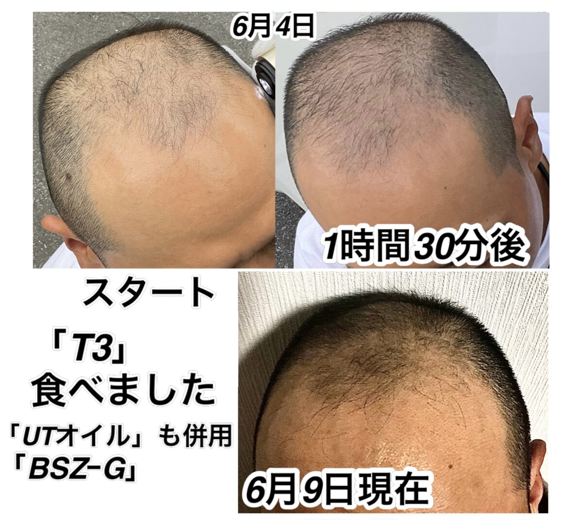 写真をアップして見て頂けるとよく分かりますが、前髪の方に長い髪の毛たちがこの数日で既に存在しています。まだ中間報告ですが、ご本人様も大変驚いて喜んでおられます。発芽をできる状態になったなら、「UTオイル」での促進を促しているだけでも、「UTオイルZ」でのメンテナンスだけでも、どちらでも育毛はされていくので、とりあえず安心と言えるでしょう。ストレスを溜めずに、ゆっくり出来れば8時間目安で寝て頂けるとより一層効果的に育毛されていきます。今の段階では、ご本人様のイメージよりも良い結果が出ていて、ご満足頂けている様なので、良かったですね。ありがとうございます。引き続き宜しくお願い致します。