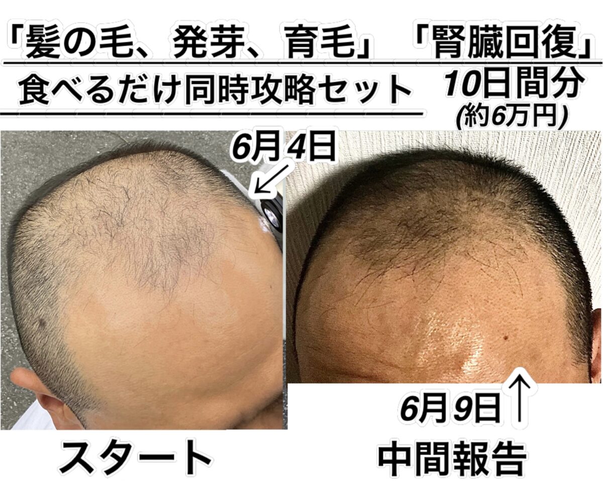 今回のお客様は、血液検査結果を持ち込んで頂けたために、身体の弱点が分かっていたので、身体の弱点が腎機能だったのですが、それを攻略しながら髪の毛の発芽をどれだけ短期間で出来るかが勝負でした。髪の毛は、発芽させること意外は簡単に出来るのですが、発芽に関しては完全に細胞レベルの話でホルモンコントロールを、食べる物だけでしなければいけないので、通常はどこも出来ないと思います。食べることのみで血液改善をし、内臓を活性化させ、ホルモン分泌を促し、必要な材料を必要なタイミングで、それらにバトンリレーの様に渡せなければこの状態にはなりません。
