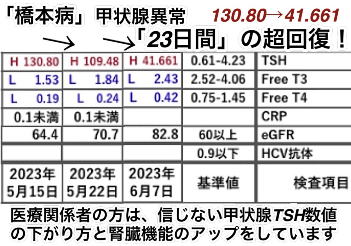 カテゴリー 結果データ(写真のみ) データBy① 投稿者 作成者: kousankashokuji 投稿日 2023年6月12日 ← 結果データBV①「Eさん」橋本病 甲状腺異常 23日間の超回復❗️同時に腎機能もさらにアップ。 → 結果データBG②「Aさん」 甲状腺下垂体ホルモン分泌異常(橋本病) 信じられない異常数値。薬を飲まずに食べただけ「一矢流」食事 2日間の変化。(6/5の検査結果が6/12の今日出たので追加報告します。)