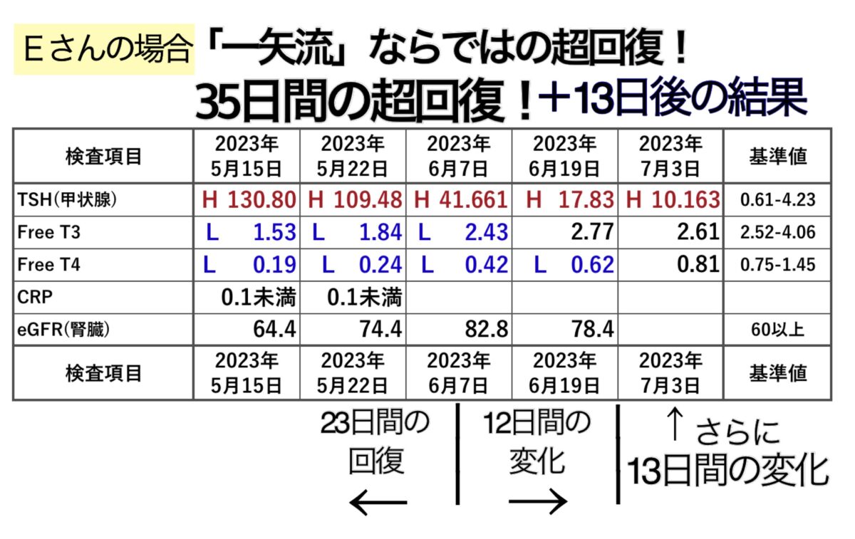 こちらの方も女性ですが、「TSH 110」を超えて推移した場合は、難病認定をされる重症の甲状腺橋本病になります。もうここまで来れば安全だと思われます。次回の報告もいただけるようであれば、今月中には正常値になっていると思います。ぜひ次回の報告もいただき、正常値の数値を表記したいですね。引き続きよろしくお願いします。
