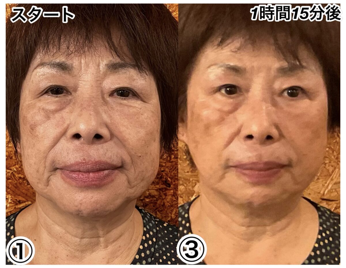 これは同じ比率の写真です。まず目が大きくなり、顔全体を小顔にし、鼻が小さくなり、もう耳の位置が上がっています。たるみが一気に元の位置に戻り、首のシワが消えました。ほうれい線も浅くなり短くなりました。完全に10歳は軽く若返ったと思います!