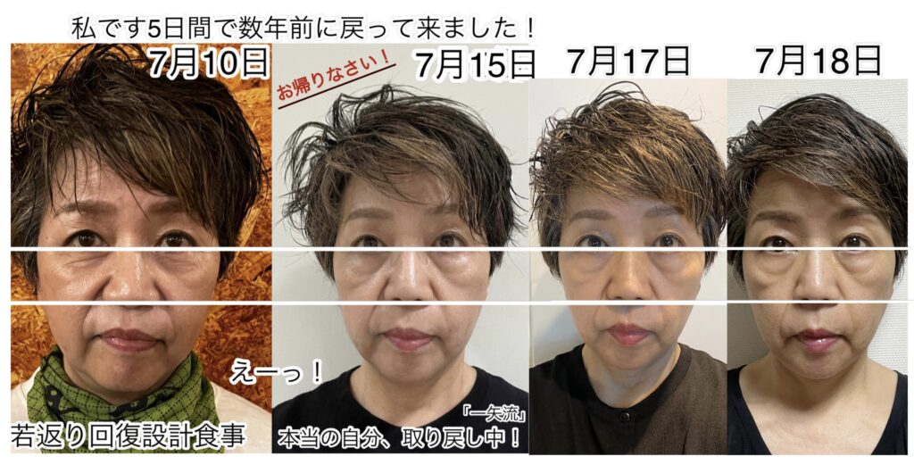 このお客様の場合は身体の内容が悪く、ギリギリの大腸がんの前兆が出ていました。腸活を取り戻すために結構苦労し、本格的な腸活を正常化するのに9日間かかったので、実はこの10日間と言う7月18日から本当のスリーセブンが揃ったような環境にやっとたどり着いた状況でこちらのお顔になります。