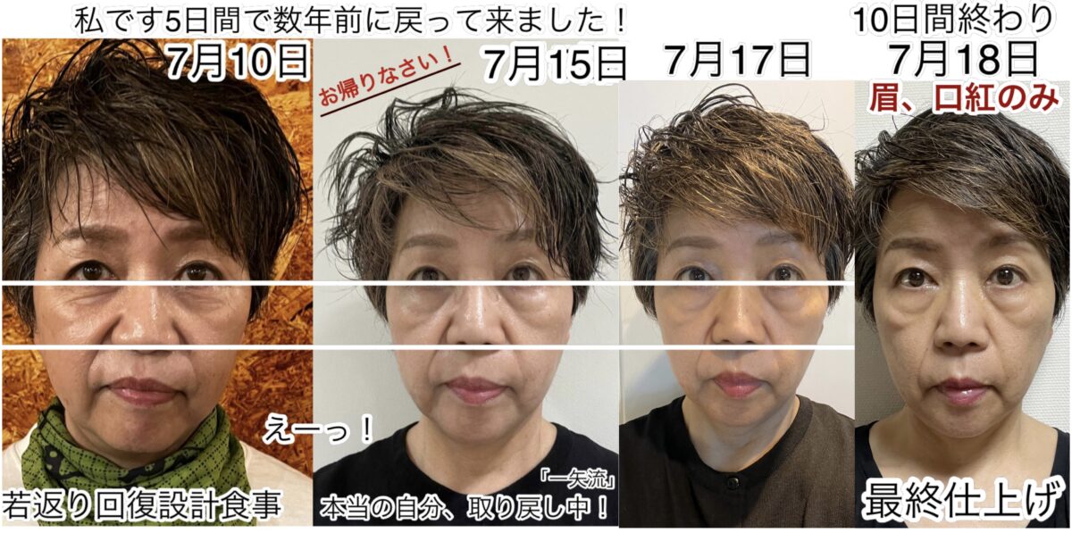 このお客様の場合は身体の内容が悪く、ギリギリの大腸がんの前兆が出ていました。腸活を取り戻すために結構苦労し、本格的な腸活を正常化するのに9日間かかったので、実はこの10日間と言う7月18日から本当のスリーセブンが揃ったような環境にやっとたどり着いた状況でこちらのお顔になります。