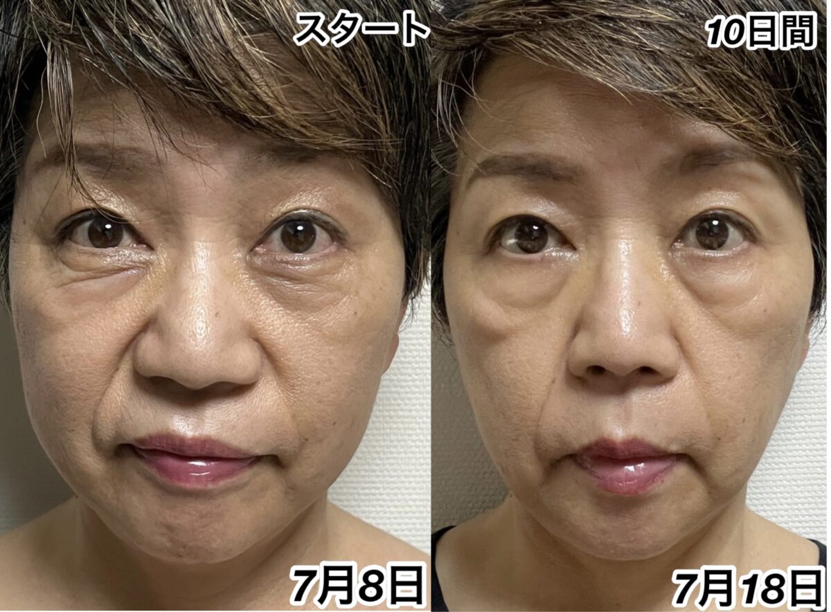 スタートの7月8日から7月18日で10日後になります。目の下の横に走るシワを気にされておりました。それをなくしたいとのお話で、身体の血液検査項目にも色々な課題はありましたが、およそクリアしたはずです。この違いは当然血液が変わり各内臓が変わった結果の若返りになります。