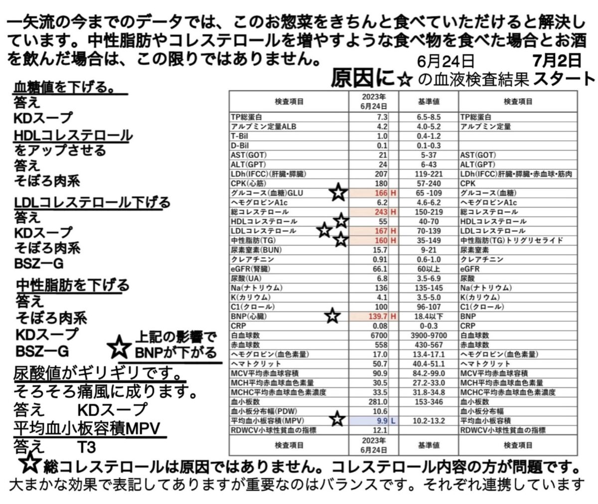 血液検査項目の星印のところがポイントになっていますので、それらを改善するべく、当然心臓を改善するべく、食事摂取をしながらポイントはお酒を飲みながらという所ですが、まずお酒を飲むと言う事は重要栄養素である亜鉛が流れると言うことでほかもその栄養摂取比率で動いているので、それらにも影響があり、さらに栄養素たちの各それぞれのパラメーターが計算できなくなるのでなかなか厳しいです。「その中での変化」だと言う前提でご覧ください。