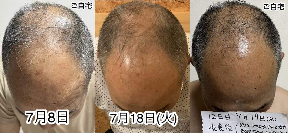 また後日アップしますが、この7月18日の「T3Z」をその場で食べていただき、1時間前と1時間後の髪の毛の状態などを詳細に記した写真データなどを後にアップしますが、1時間で発毛していました。後日写真を載せます。その結果が7月19日。1本1本の太さも太くなり、活性化が一気に始まったので詳細をお楽しみにしておいてください。